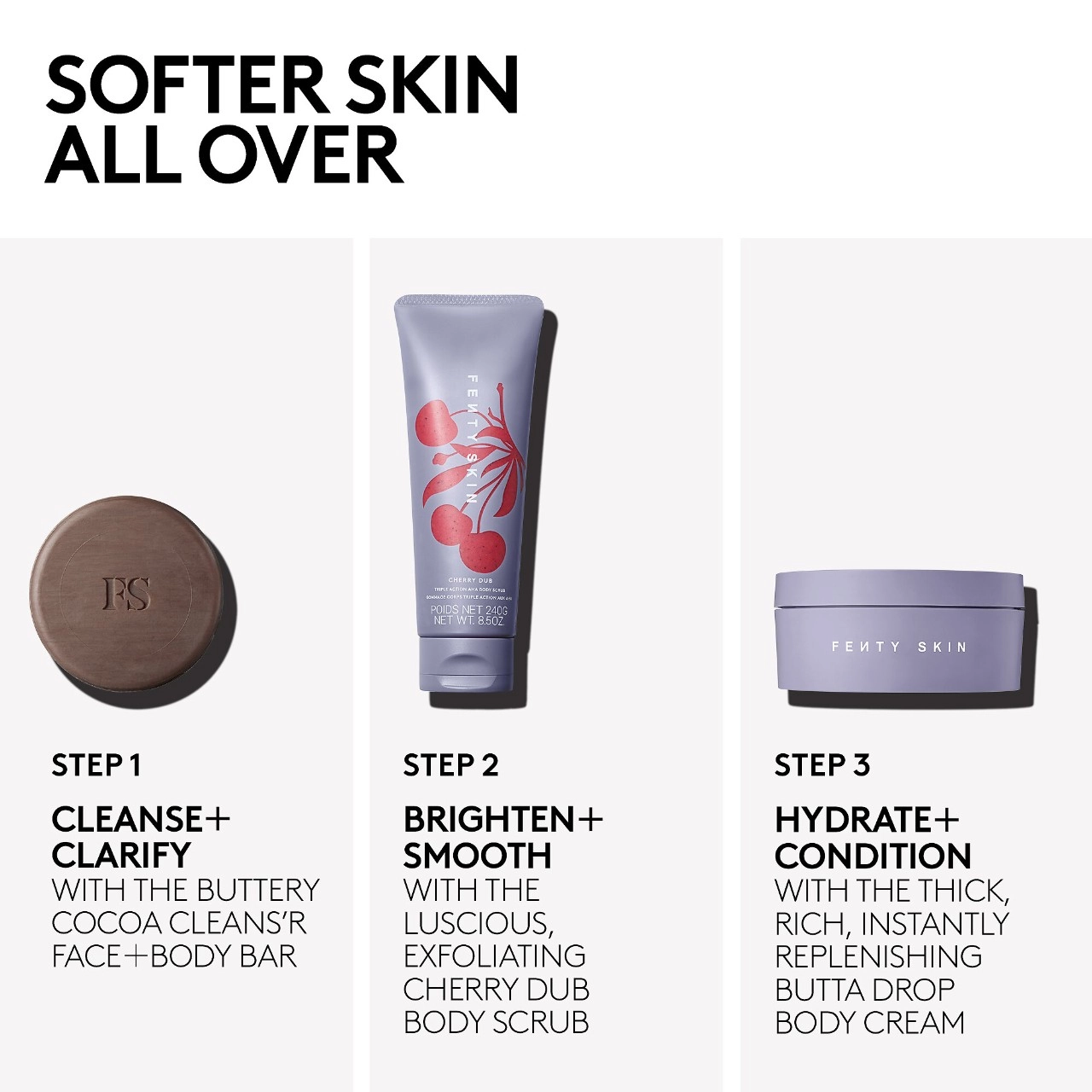 Experience the ultimate in exfoliation with the Fenty Skin Cherry Dub Triple Action AHA Body Scrub. This luxurious body scrub is formulated with AHAs, fruit enzymes, and sugar to visibly retexturize, smooth, and nourish your skin. Say goodbye to rough, uneven skin and hello to a more even texture and tone.