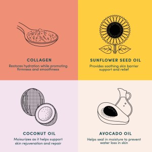 - Formulated with sunflower seed oil, collagen, and coconut oil