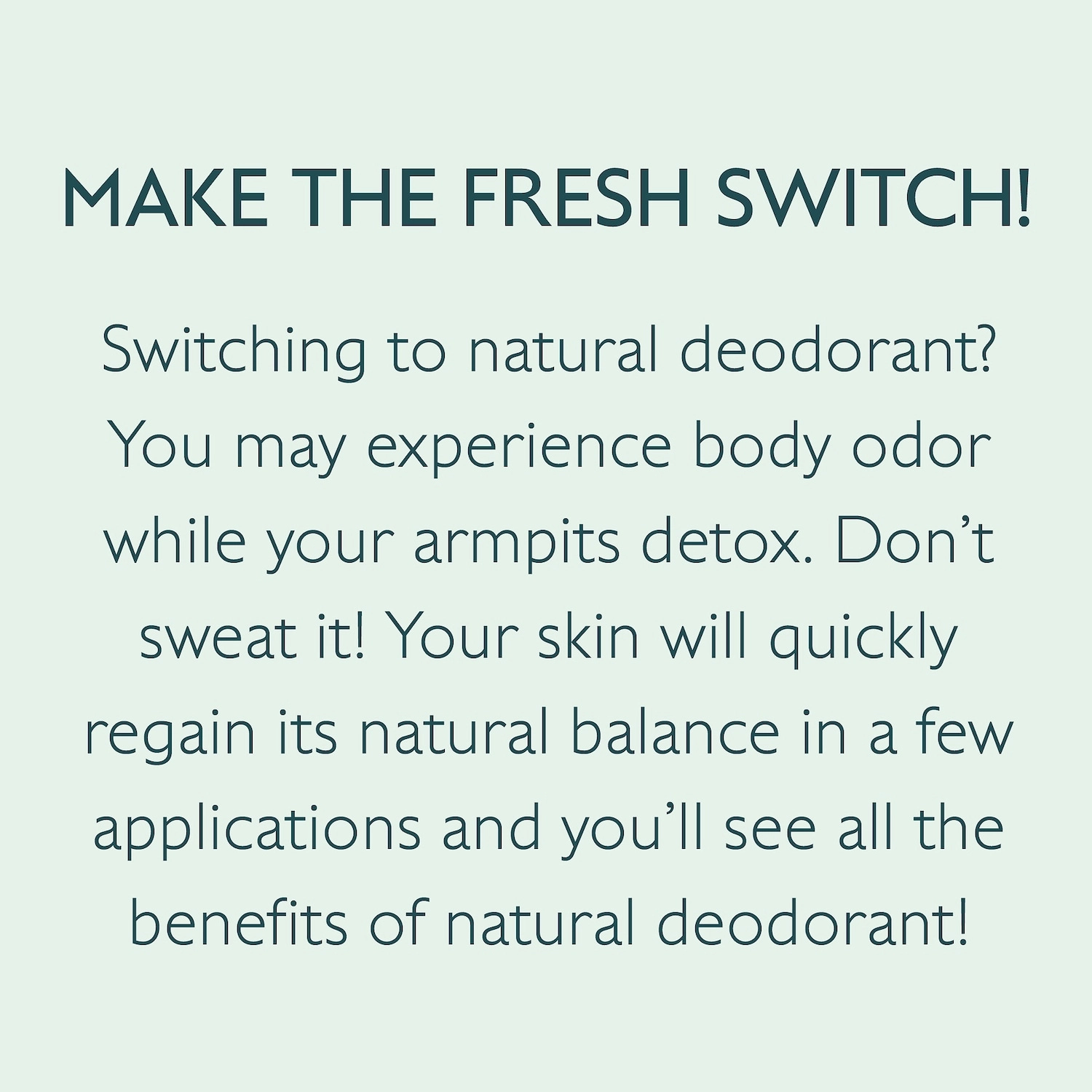 Apply daily as needed, 5 to 10 swipes on clean and dry underarms. If you’re making the switch to natural deodorant, you may experience body odor for a short period while your armpits detox.