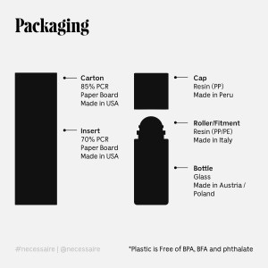 Nécessaire has partnered with How2Recycle to provide third-party verified recycling claims. To recycle the bottle, remove the cap and roller/fitment, rinse the bottle, and recycle it with glass. Please note that the cap and roller/fitment are not curbside recyclable. The carton and insert can be recycled with paper. For items that are not readily recyclable via curbside in the US, please consider using Nécessaire’s verified TerraCycle partnership at terracycle.com/necessaire.