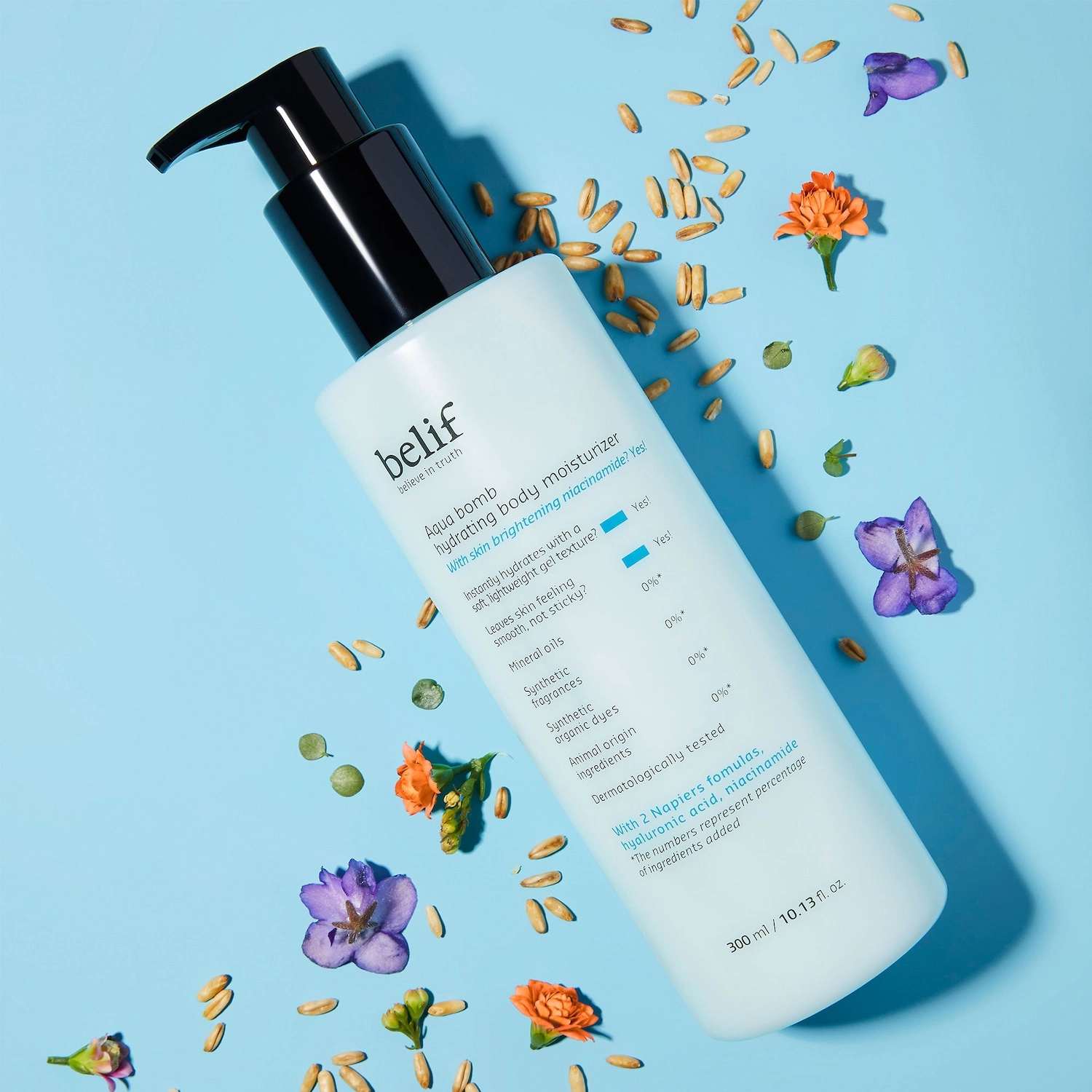 Experience intense hydration with belif Aqua Bomb Hydrating Body Moisturizer. This lightweight gel is formulated with Niacinamide and Hyaluronic Acid to provide visible brightening, smoothing, and hydrating effects. Suitable for dry and combination skin types, this fast-absorbing moisturizer leaves your skin looking healthy and hydrated.