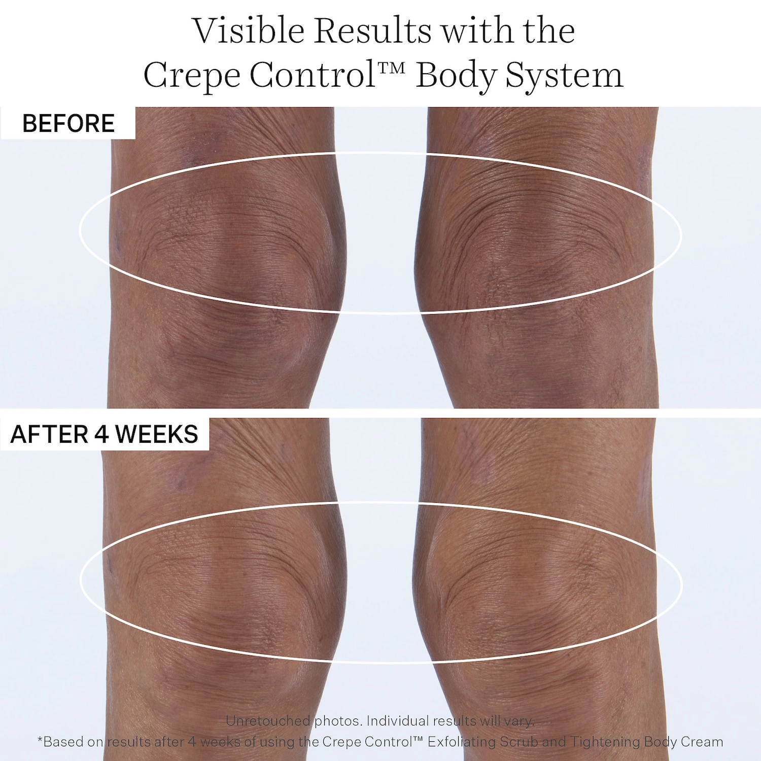 Clinical Results: Based on results from an expert clinical grading evaluation on 35 subjects using the Crepe Control Exfoliating Body Scrub and Tightening Body Cream, 94% showed an improvement in the appearance of crepey skin after 4 weeks, and 100% of the panelists showed an improvement in the appearance of radiance after 8 weeks.