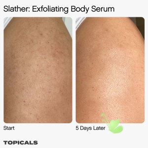 Topicals Slather Exfoliating Body Serum with Retinol and AHAs is a powerful yet gentle milky body serum that addresses visible roughness, dry patches, bumps, scales, dullness, strawberry skin, and flakiness. This lightweight cream is suitable for normal, dry, combination, and oily skin types.