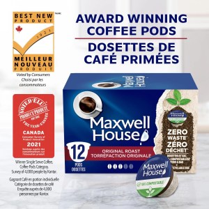 - 114g box of Maxwell House Original Roast Coffee 100% Compostable Pods, 12ct