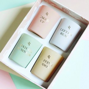 – Scent: Caked Up (salty lemon, tropical fruit, pineapple), Left on Read (white cedar, caramel, musk), Cuffing Season (lavender, vanilla), Matcha Business (floral)
