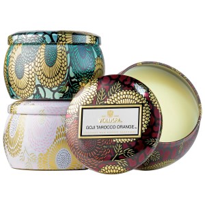 Experience the luxury of Voluspa with this Mini Candle Trio. Treat yourself or surprise a loved one with this exclusive set of beautifully scented candles. The fragrances range from citrus and fruity notes to woody scents, creating a delightful sensory experience. Each candle is hand-poured into a four-ounce decorative tin and topped with a lid to keep it dust-free when not in use.