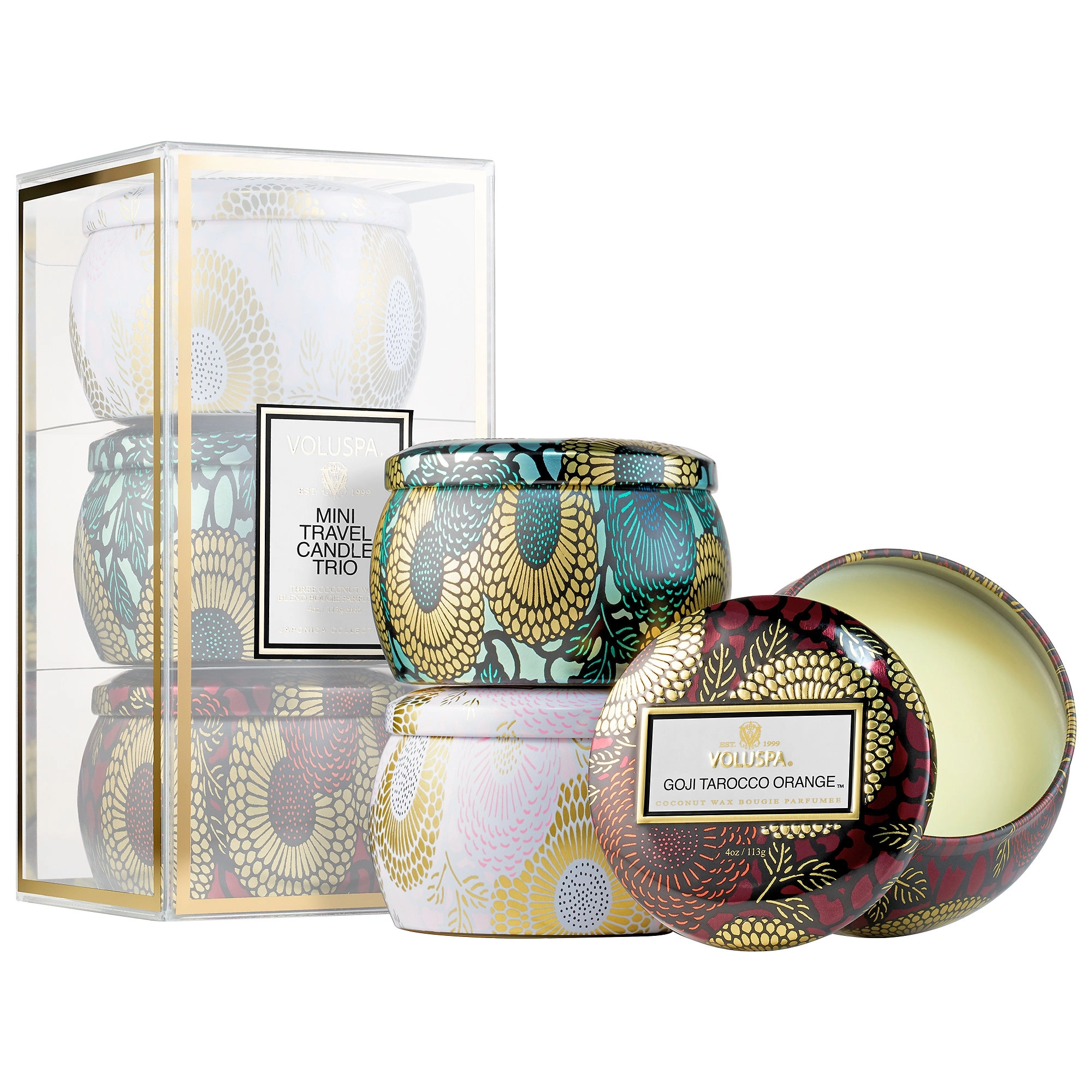 Indulge in the luxurious scents of the VOLUSPA Mini Candle Trio. This exclusive set features three 4 oz candles in the fragrances French Cade & Lavender, Goji & Tarocco Orange, and Panjore Lychee. Each candle is hand-poured in the USA using Voluspa’s clean-burning coconut wax blend and features 100% natural wicks.