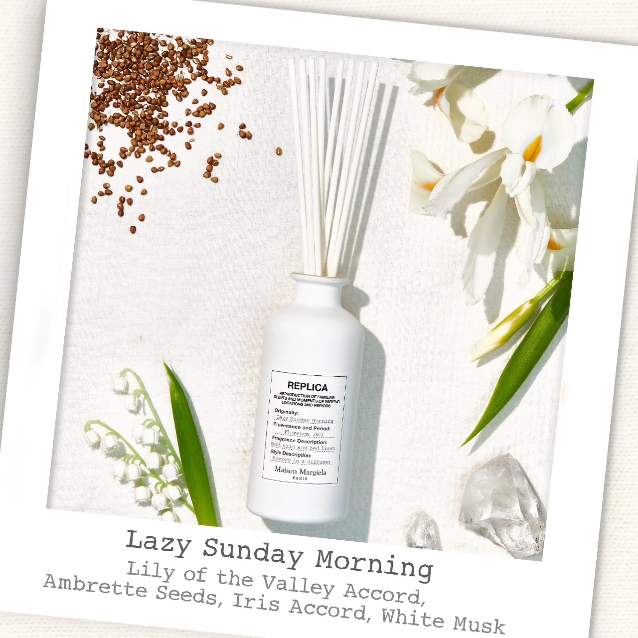 Experience the sensation of silky sheets and the simple joy of sleeping in with the Maison Margiela REPLICA’ Lazy Sunday Morning Diffuser. This home fragrance diffuser captures the essence of lazy Sunday mornings, enveloping your space in a delicate blend of florals and musks. The fresh floral scent combines lily of the valley, iris accord, and white musk, creating a warm and spicy fragrance that evokes the feeling of mornings wrapped in fresh cotton sheets.