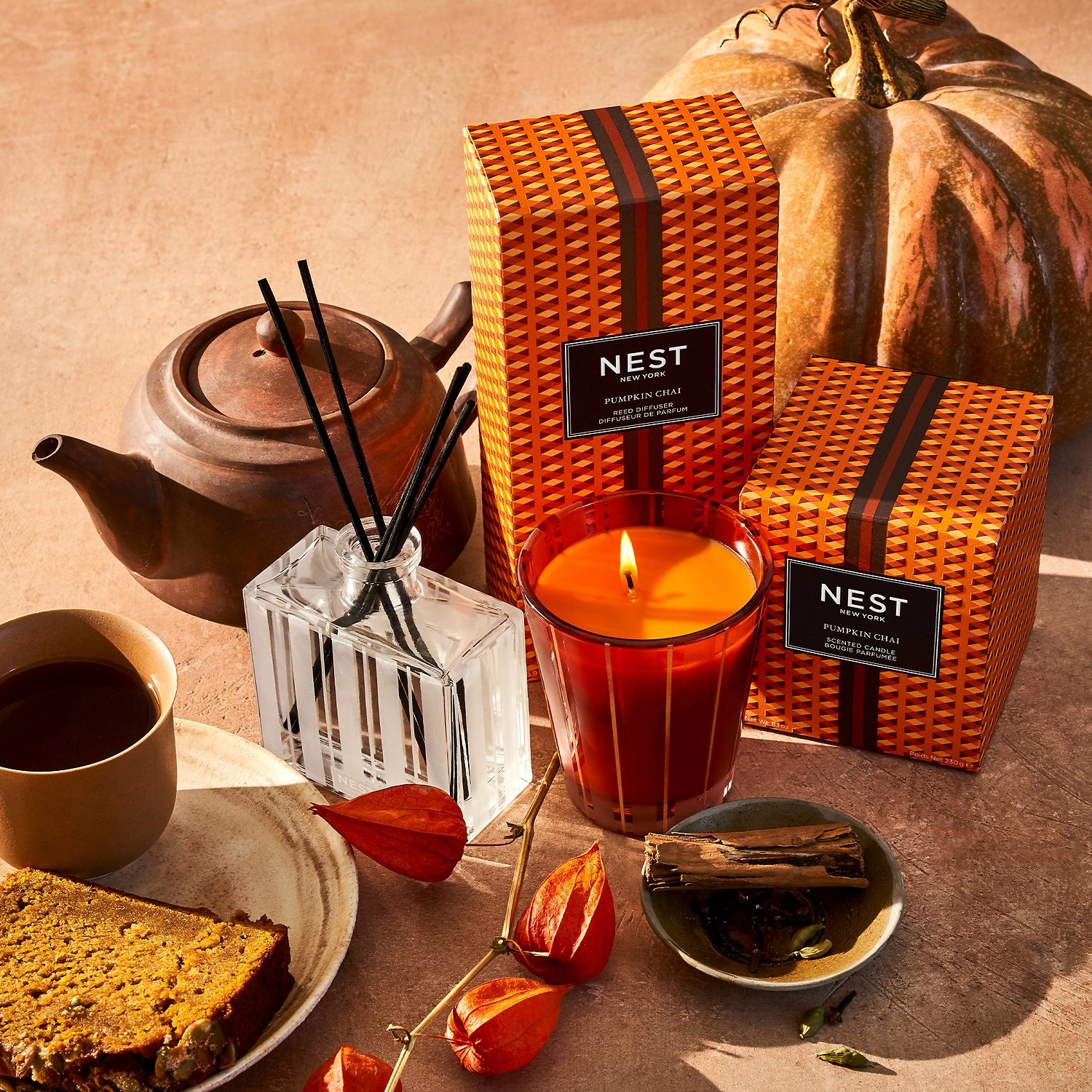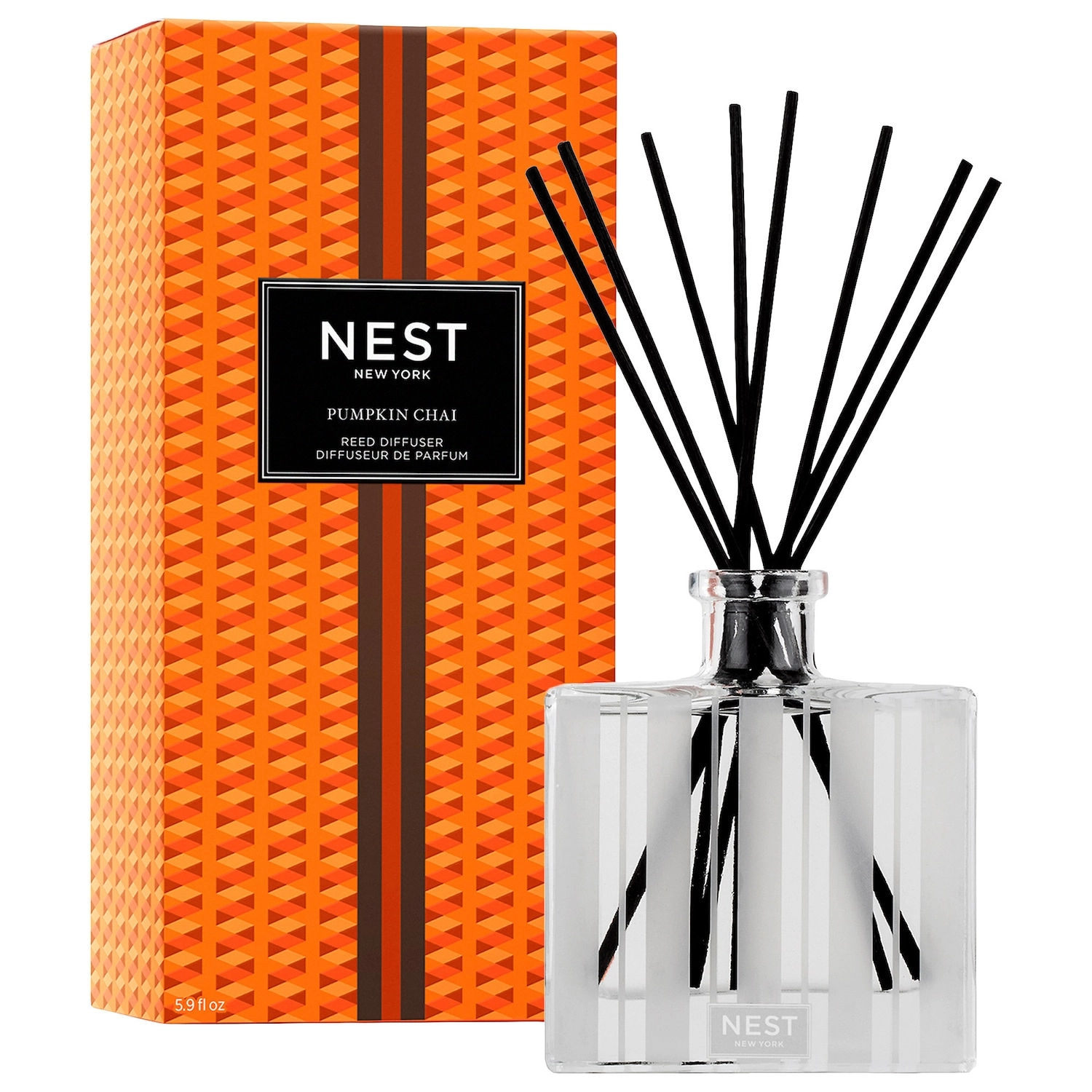 Elevate your home with the warm and inviting scent of the NEST New York Pumpkin Chai Reed Diffuser. Order yours today and create a cozy autumn ambiance in any room.