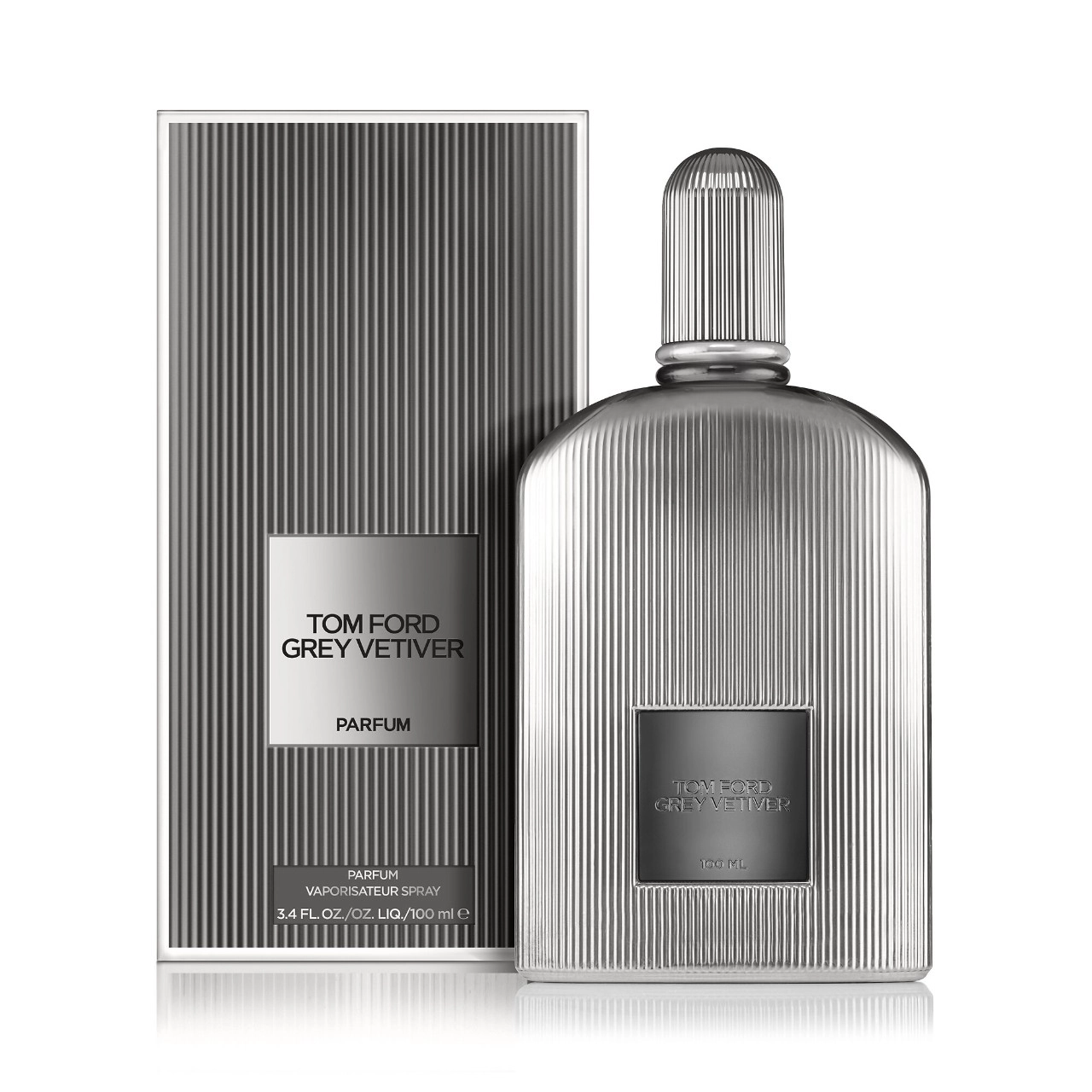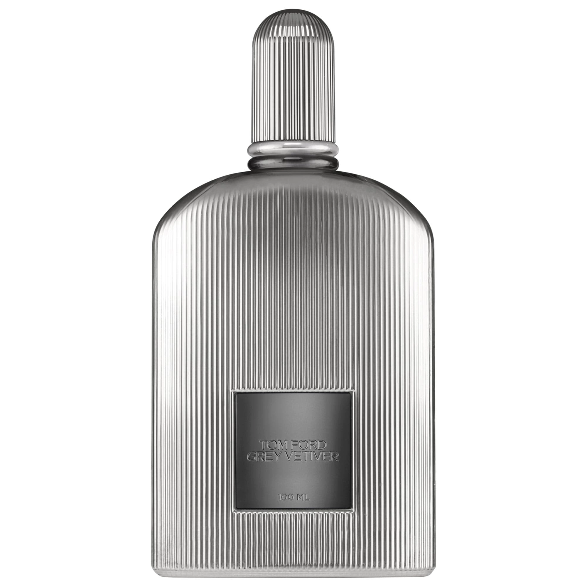 The TOM FORD Grey Vetiver Parfum is elegantly packaged in a silver-toned flacon with fluted detailing, reflecting the brand’s refined aesthetic.