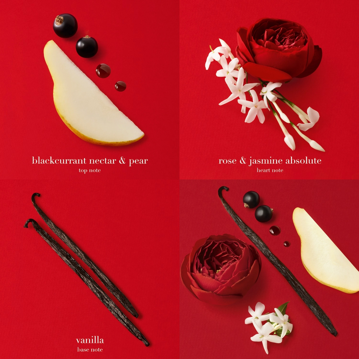 The fragrance opens with a burst of sparkling pear, instantly catching attention. It then reveals a deep rose-petal heart, adding a touch of romance to the scent. The smoldering woody-vanilla base adds a seductive and mysterious touch, leaving a lasting impression.