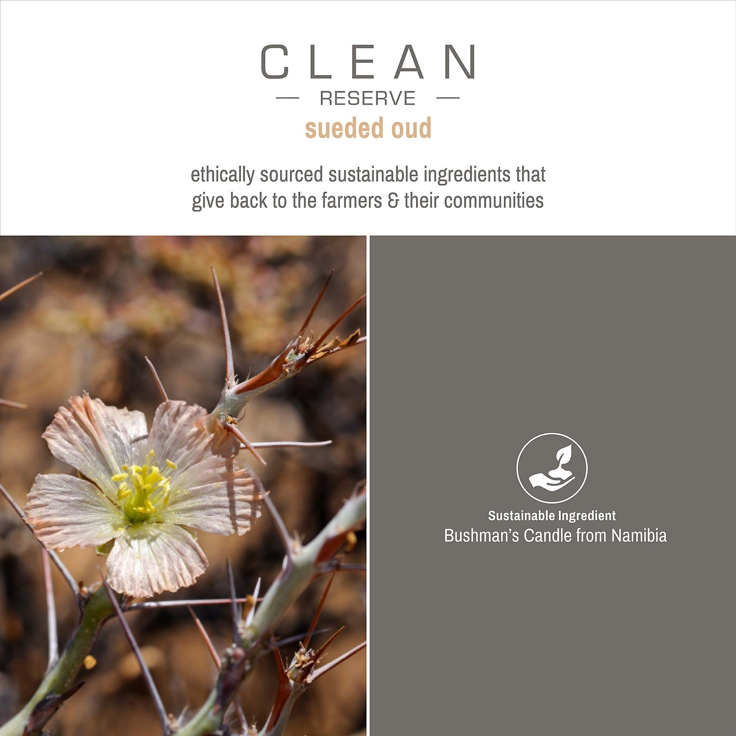 The sustainable packaging of this perfume reflects CLEAN RESERVE’s commitment to the health of the planet. The cap is made of sustainable wood from Spain, and the cellophane is biodegradable and compostable. By choosing CLEAN RESERVE Reserve – Sueded Oud, you’re not only treating yourself to a luxurious fragrance, but you’re also supporting the economic development and preservation of the nomadic Himba tribe’s traditional way of life through the use of sustainable Bushman’s Candle from Namibia.