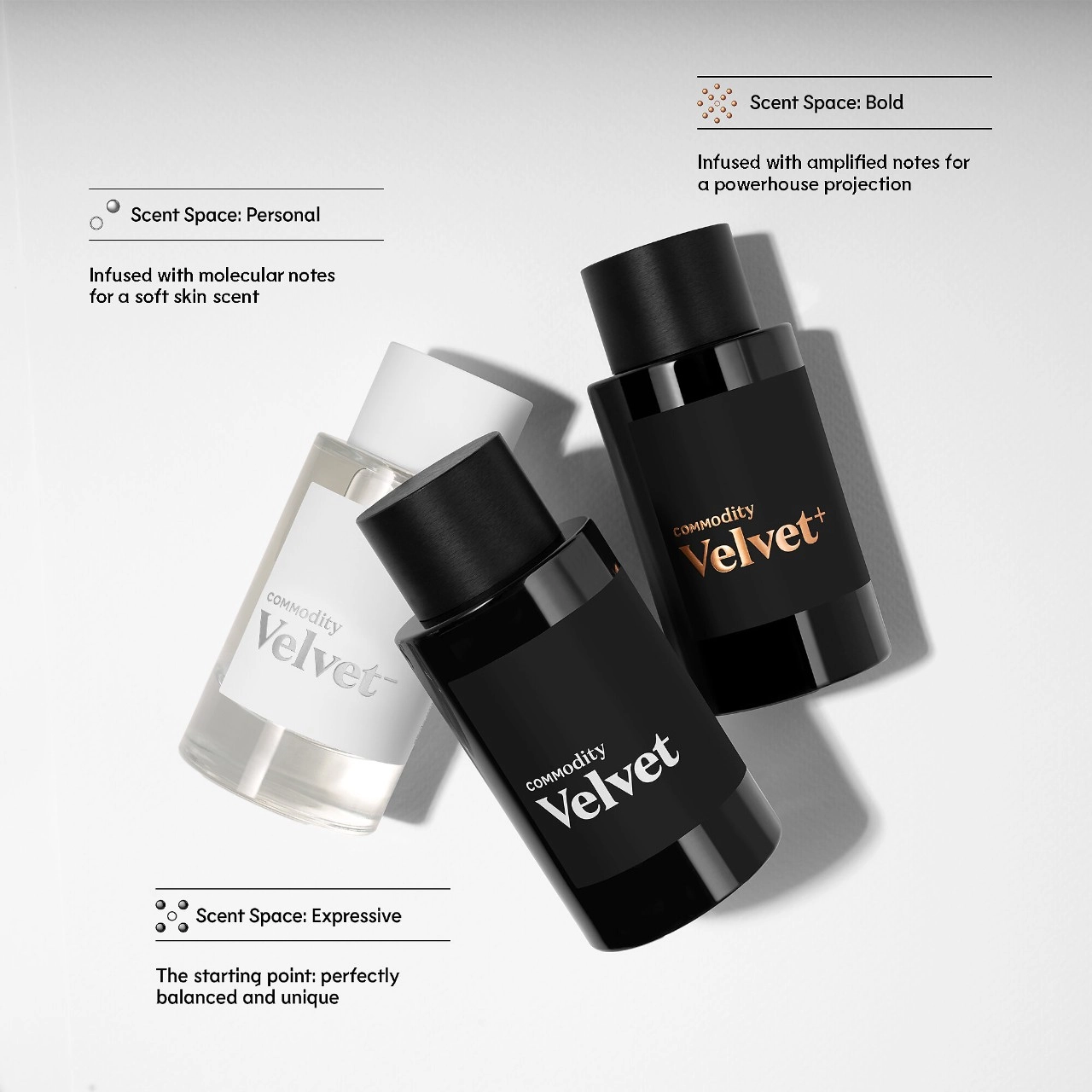 The Personal fragrance of Commodity Velvet- Personal Eau de Parfum is housed in an all-white bottle, symbolizing the soft and ethereal nature found across the Scent Space. The minus sign after the name indicates a decrease in projection, making it perfect for those who prefer a more subtle scent.