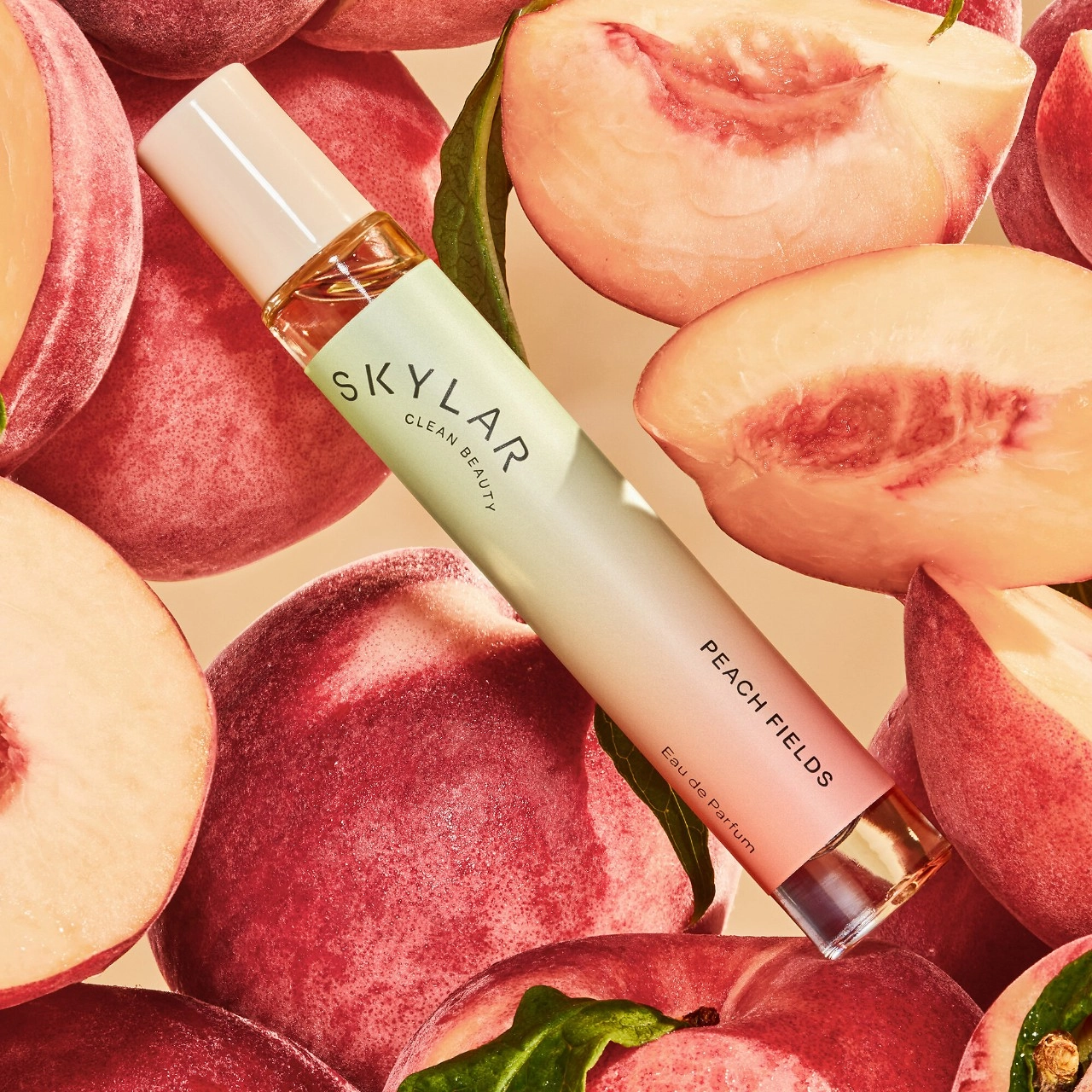 SKYLAR Peach Fields Eau de Parfum comes in a beautifully designed square bottle that sits comfortably in the palm of your hand and elegantly on your vanity or tabletop. The bottle, cap, and box are 100 percent recyclable, reflecting SKYLAR’s commitment to sustainability.