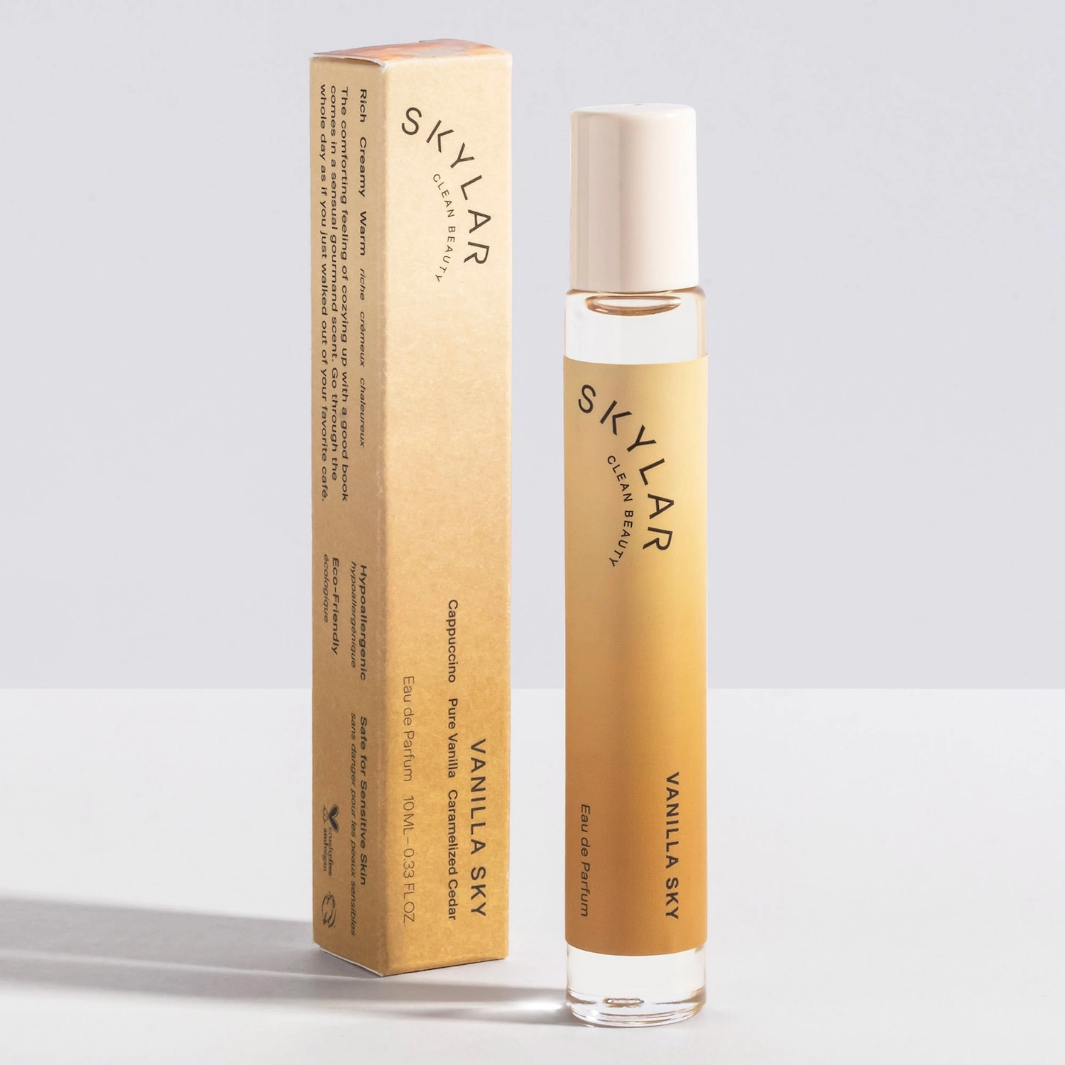 SKYLAR Vanilla Sky Eau de Parfum Rollerball is a gourmand fragrance that exudes comfort and sensuality. The warm vanilla notes blend harmoniously with hints of cappuccino, creating an irresistible aroma. The fragrance is grounded by caramelized cedarwood, adding a rich and golden warmth reminiscent of stunning golden-hour skies.