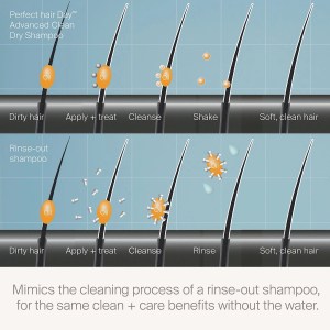 To achieve maximum results, shake the can extremely well before use. Hold the can six to ten inches away from dry, dirty hair and apply the product in a sweeping motion. Wait for 30 seconds and then remove the powder by massaging and shaking at the roots with your fingers or a brush. Apply more as needed, shaking the can again. Style your hair as desired.