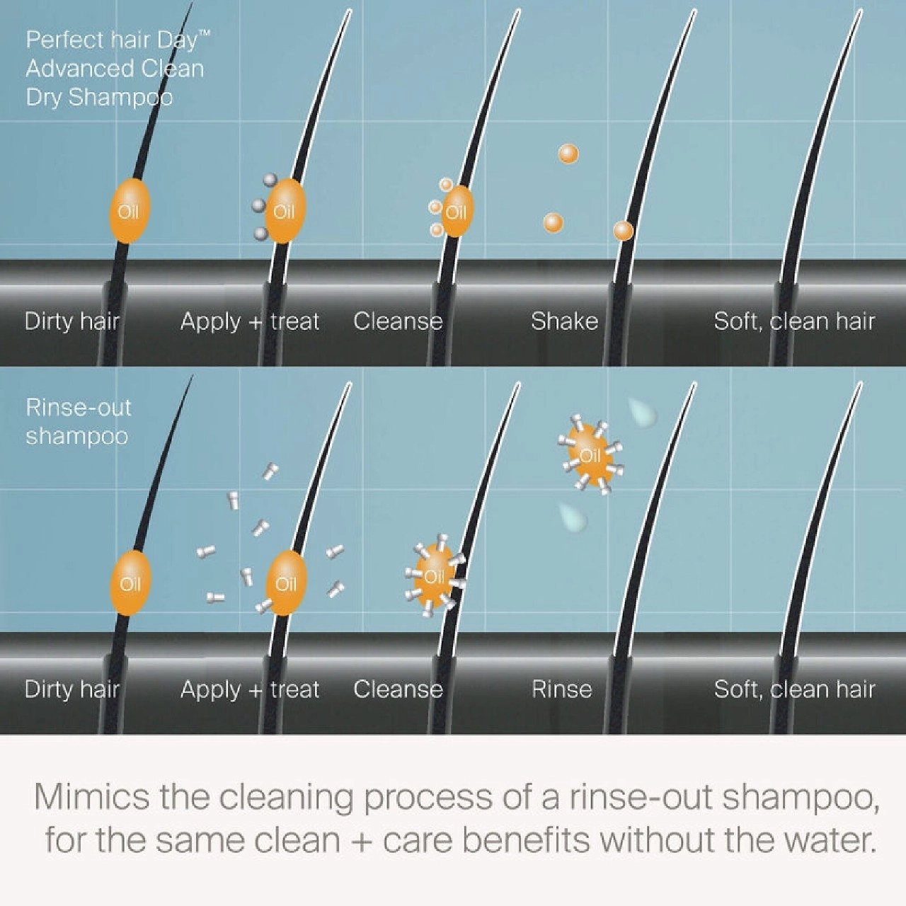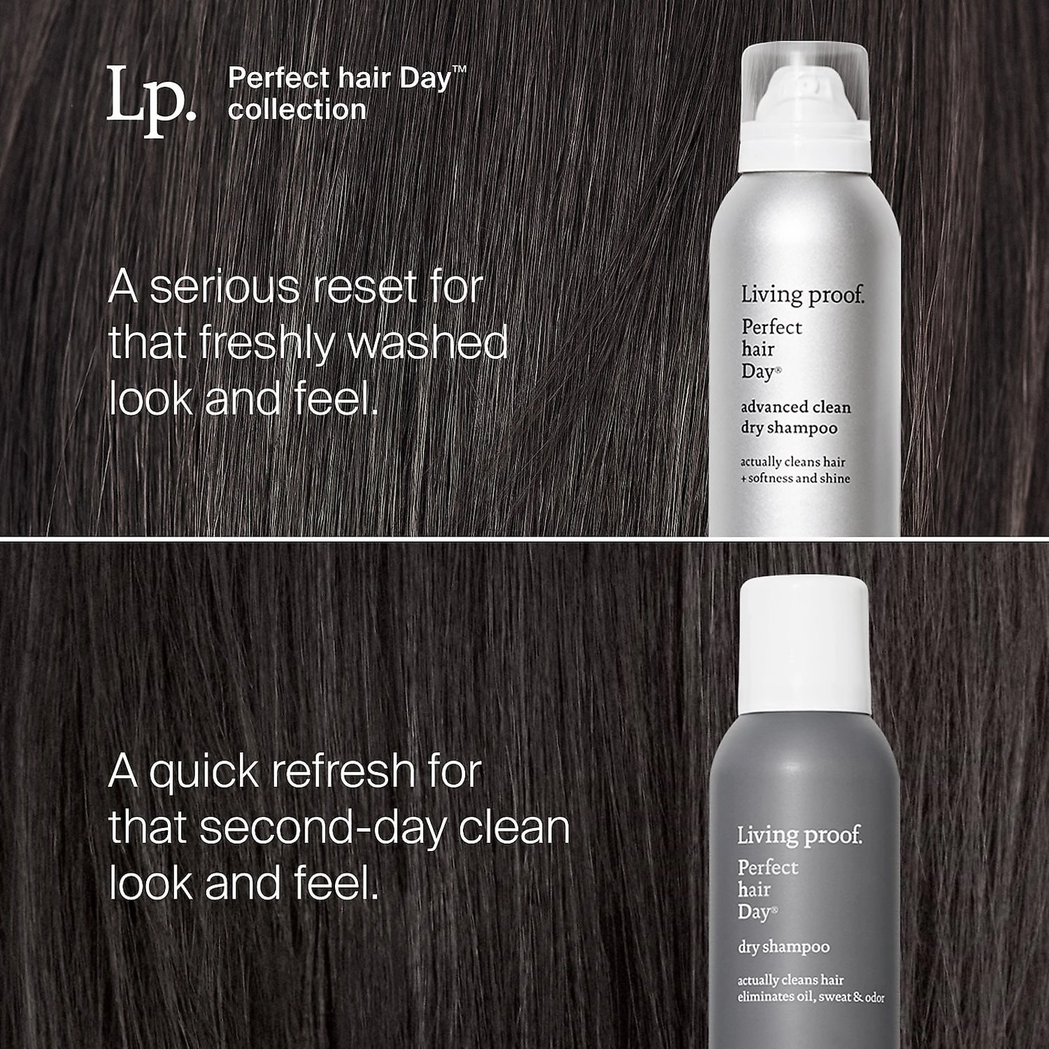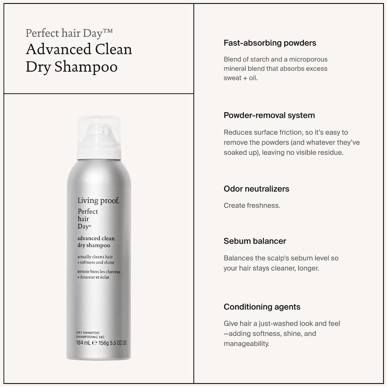 What Else You Need to Know: Living Proof Perfect Hair Day (PhD) Advanced Clean Dry Shampoo is not just a dry shampoo. It cares for your hair as it cleans. The fast-absorbing powders soak up oil, sweat, and odor, and are then removed with a powder-removal system. Conditioning agents refresh the scalp, balance sebum levels, and leave your hair soft and shiny. The result is a freshly washed look and feel.