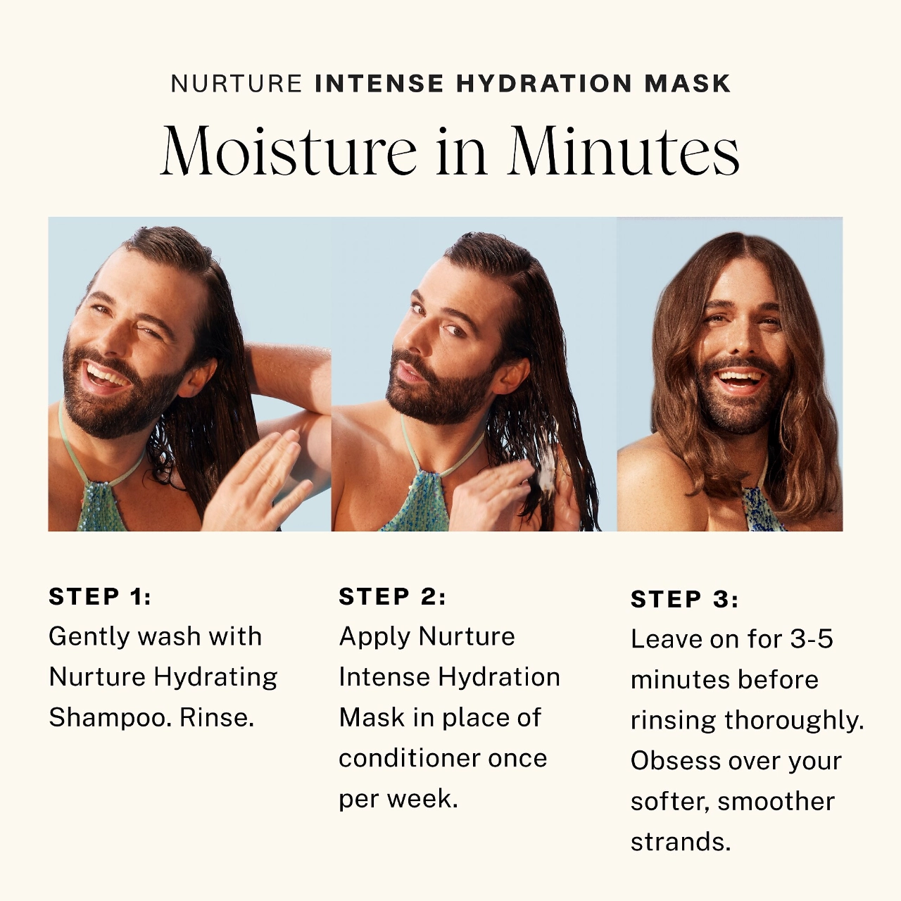 Deeply infuse moisture to transform dry hair and nourish split ends for your softest strands with JVN Nurture Intense Hydration Hair Mask. This richly moisturizing hair mask is formulated with JVN’s unique triple hydration system, providing up to 72 hours of instant hydration after a single use. Say goodbye to dryness, frizz, and damage as this mask leaves your hair 15x easier to comb.