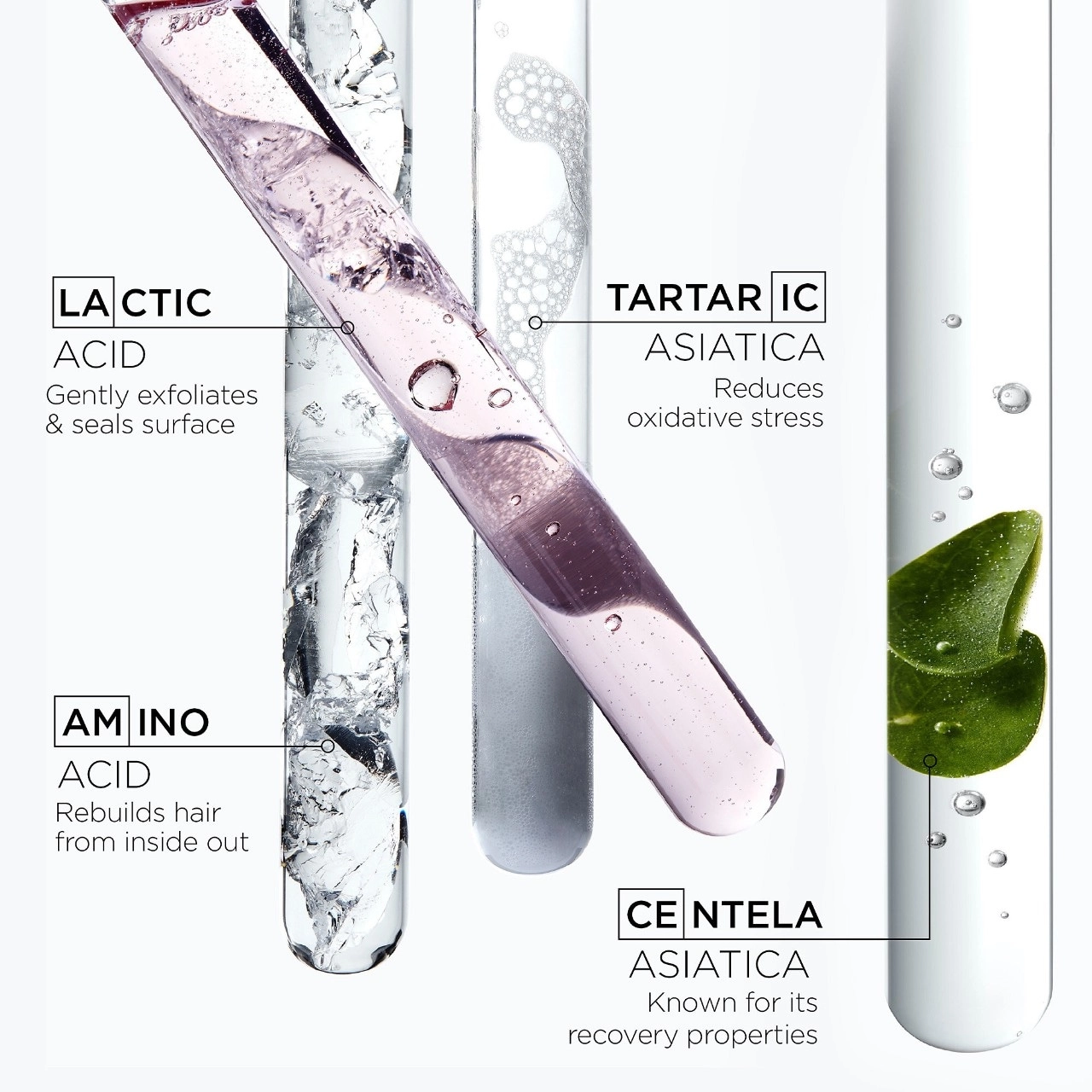 This gloss treatment is formulated with a healing acid blend of Amino Acid, Lactic Acid, and Tartaric Acid. These ingredients target the three levels of hair damage and penetrate to recover hair from color-induced damage, preventing color stripping or fading. Other key ingredients include Centella asiatica extract and Tocopherol.