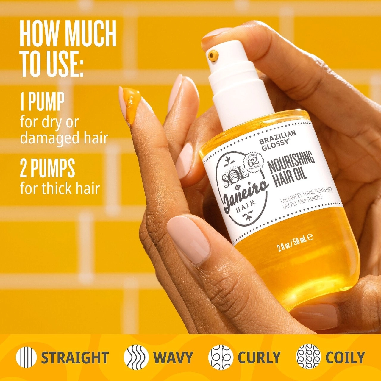 Indulge in the Sol de Janeiro Brazilian Glossy™ Nourishing Anti-Frizz Hair Oil and enjoy frizz-free, shiny hair that is protected from heat damage. Order yours today and experience the transformative power of Patauá and Pequi oils.