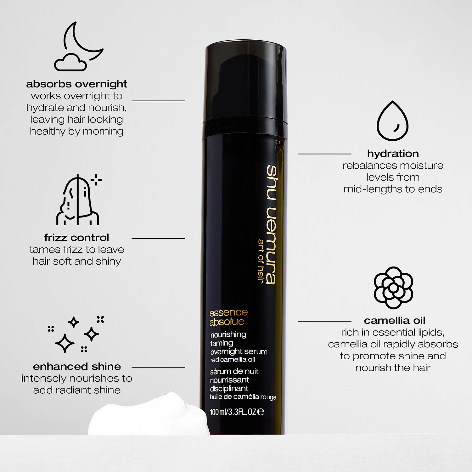 Wake up to flawless hair with shu uemura Essence Absolue Overnight Nourishing Hair Treatment. This professional overnight serum is the key to nourished, soft, and frizz-free hair. The lightweight cream formula, infused with precious Japanese red camellia oil, is quickly absorbed, non-greasy, and color-safe. Say goodbye to dryness and hello to enhanced shine with this pillow-proof treatment. Order yours today and wake up to beautiful hair every morning.