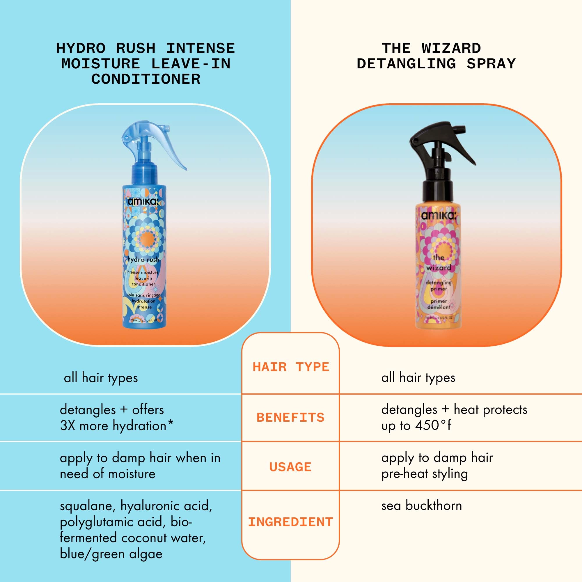 Experience the ultimate hydration boost with amika Hydro Rush Intense Moisture Leave-In Conditioner. This unique formula, featuring hyaluronic acid and squalane, provides three times more hydration and lasting moisture, while effectively detangling your hair. Whether you have fine, medium, or thick hair, this clean and vegan leave-in conditioner ensures a lightweight, non-greasy feel and a reduction in frizz. Give your hair the love it deserves with this clinically proven solution.