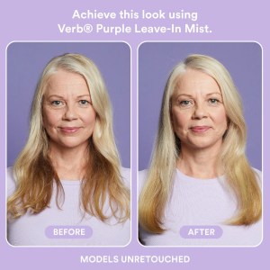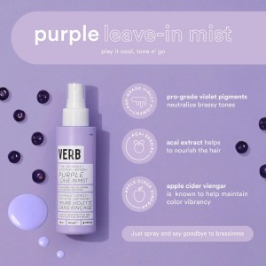 Tame brassiness and refresh your hair with Verb Purple Styling Leave In Hair Mist. This 3-in-1 mist tones, detangles, and hydrates, neutralizing brassy yellow hues while nourishing your hair with antioxidant-rich açai extract. Maintain color vibrancy with the help of apple cider vinegar. This vegan and cruelty-free mist is perfect for all hair textures and is free of parabens. Shake well, spray onto dry or damp hair, and distribute evenly for smooth, vibrant locks. Avoid contact with clothing and surfaces, and use only as directed to prevent temporary purple hair.