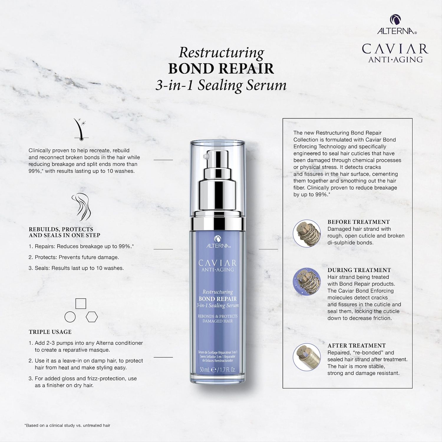 Experience the transformative power of ALTERNA Haircare CAVIAR Anti-Aging® Restructuring Bond Repair 3-in-1 Sealing Serum. Repair, protect, and seal your damaged hair for healthier, more vibrant locks.