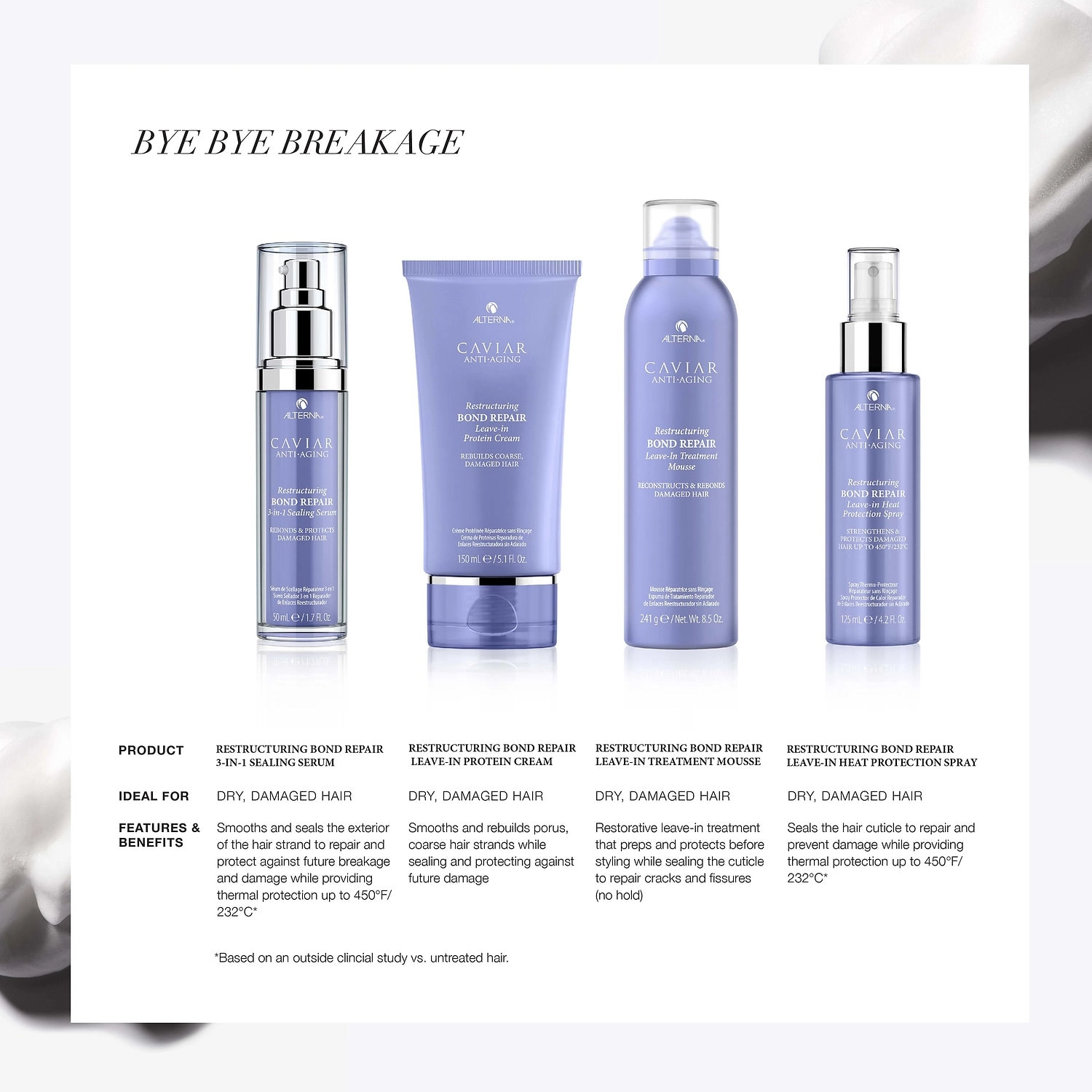 Transform your hair with ALTERNA Haircare CAVIAR Anti-Aging® Restructuring Bond Repair Leave-In Protein Cream. This deeply restorative leave-in treatment is packed with protein to repair coarse, porous, and damaged hair. It reduces breakage by up to 99% and smooths and rebuilds your hair, leaving it stronger and healthier. Protect your hair against future damage with this nourishing cream.