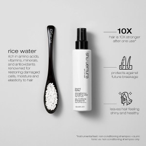 Strengthen and nourish your hair with the Shu Uemura Izumi Tonic Strengthening Rice Water Treatment. This leave-in treatment is infused with Japanese-sourced rice water and ceramides to restore elasticity, prevent breakage, and increase shine. Suitable for all hair types, it leaves your hair smelling fresh and voluminous.