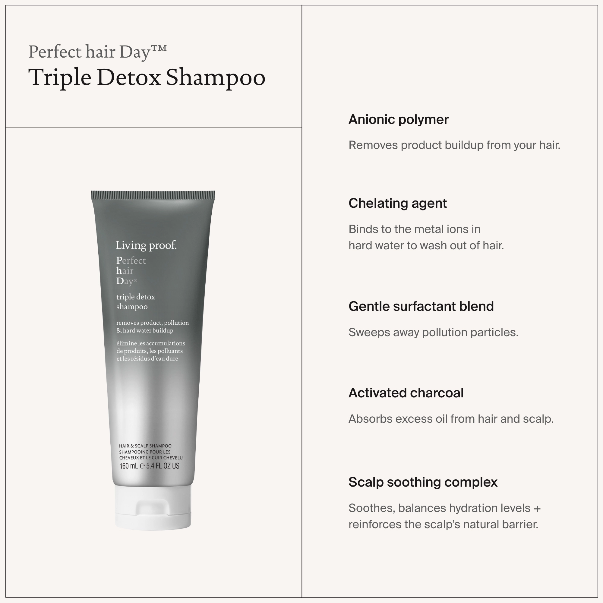 Eliminate buildup from your hair with Living Proof Perfect Hair Day (PhD) Triple Detox Shampoo. This detoxifying shampoo gently yet effectively removes product residue, pollution particles, and hard water minerals, leaving your hair softer, shinier, and more manageable.