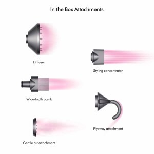 - Five attachments included: Flyaway Attachment, Styling Concentrator, Diffuser, Gentle Air Attachment, and Wide-tooth Comb.