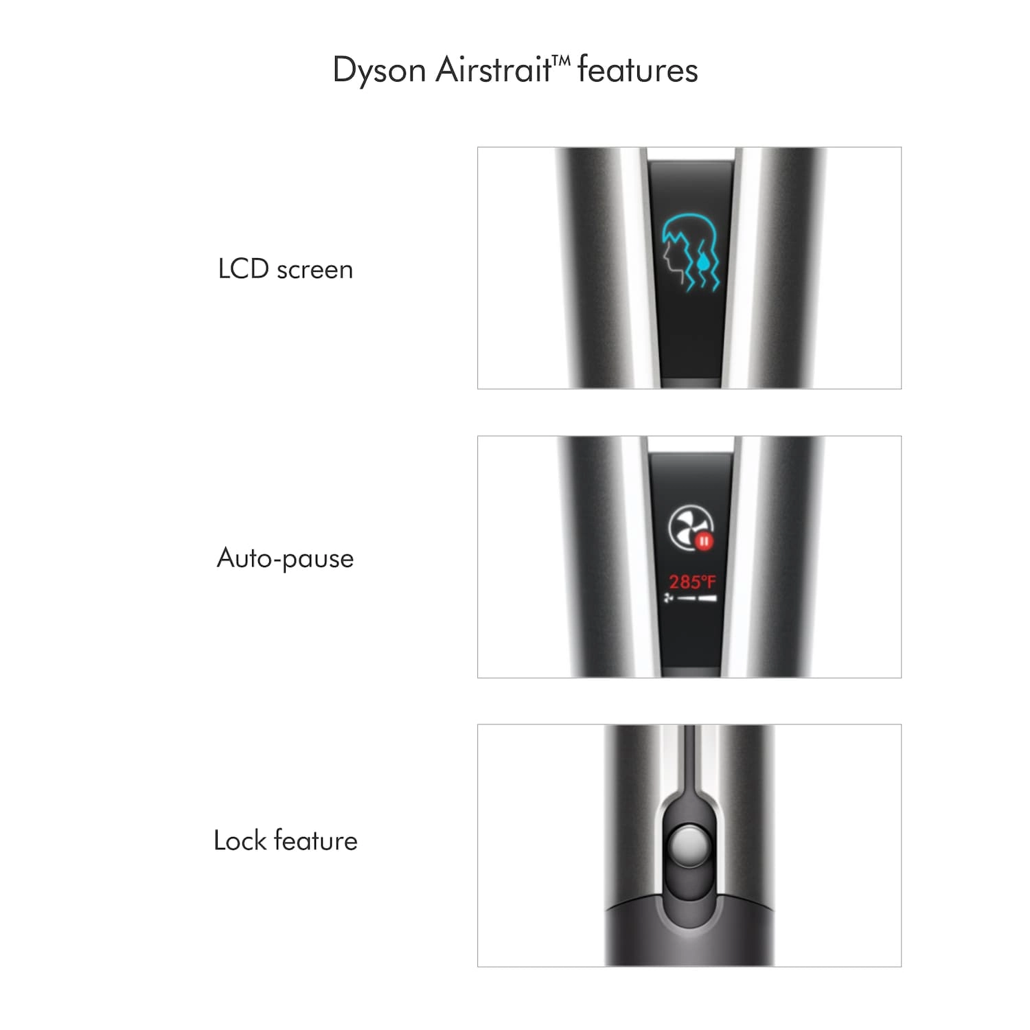 | – No wait time: | Unlike hot plates, the Dyson Airstrait™ is ready to style when you are, with no need to wait for it to heat up. |