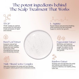 The Scalp Treatment: Aqua/Water/Eau, Glycerin, Pentylene Glycol, Erythritol, Panthenol, Citric Acid, Arginine, Caesalpinia Spinosa Gum, Saccharide Isomerate, Potassium Sorbate, Sodium Benzoate, Mentha Piperita (Peppermint) Leaf Water, Maltodextrin, Hydrolyzed Wheat Protein, Niacinamide, Magnesium Aspartate, Zinc Gluconate, Corylus Avellana Leaf Extract, Lepidium Meyenii Root Extract, Acetyl Tyrosine, Adenosine, Helianthus Annuus (Sunflower) Seed Oil, Lysine, Ornithine, Panax Ginseng Root Extract, Proline, Tocopherol, Xanthan Gum, Melia Azadirachta Leaf Extract, Nasturtium Officinale Extract, Tropaeolum Majus Extract, Levulinic Acid, Copper Gluconate, Sodium Hydroxide, Rosmarinus Officinalis (Rosemary) Leaf Extract, Sodium Citrate, Sorbic Acid, Brassica Alba Seed Extract, Hydrogenated Lecithin, Oligopeptide-177, Oligopeptide-6, Sodium Chloride, Bambusa Arundinacea Stem Extract, Hippophae Rhamnoides Fruit Extract.