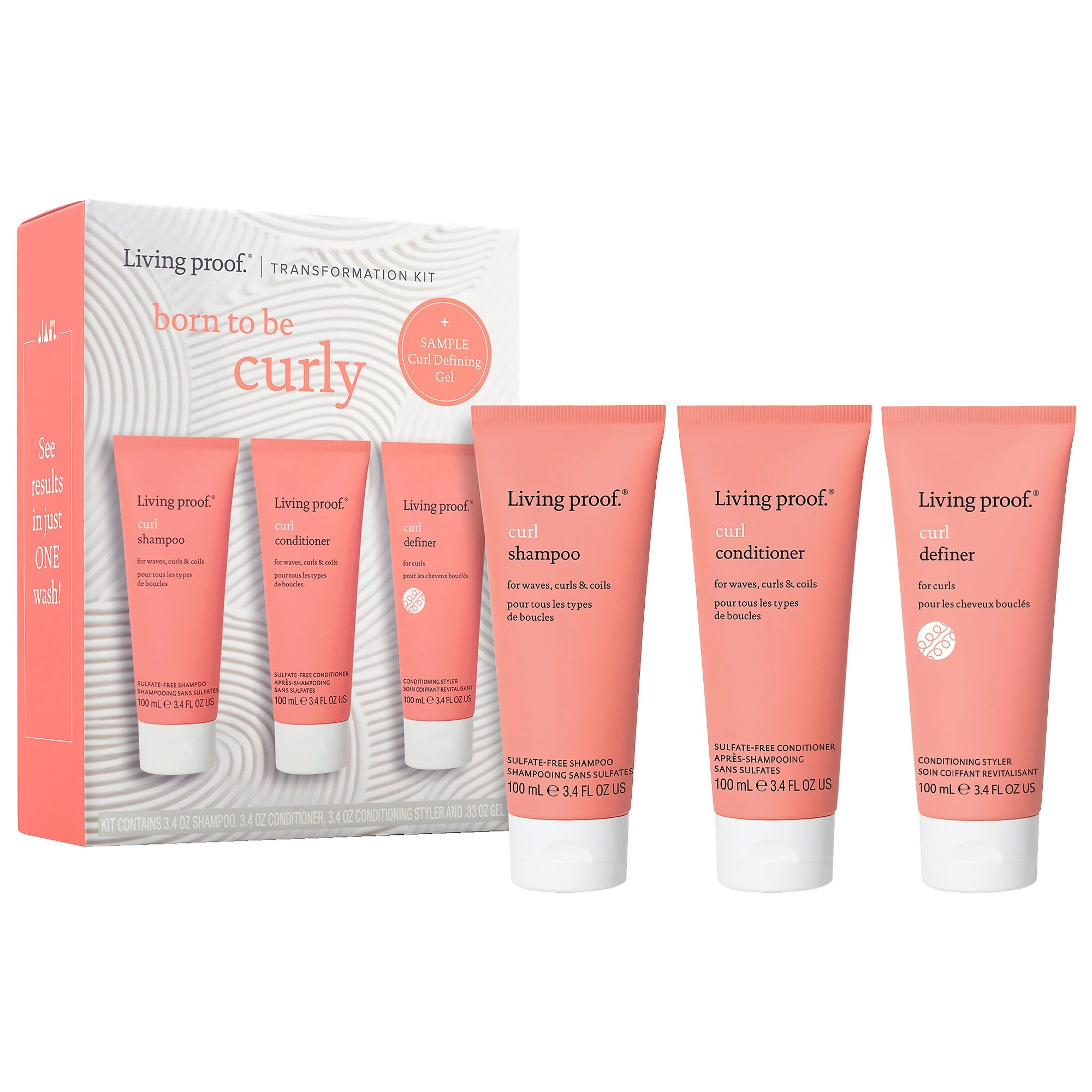 | Set Contains: | 3.4 oz/ 100 mL Curl Shampoo | 3.4 oz/ 100 mL Curl Conditioner | 3.4 oz/ 100 mL Curl Definer | 0.33 oz/ 9.75 mL Curl Defining Gel |