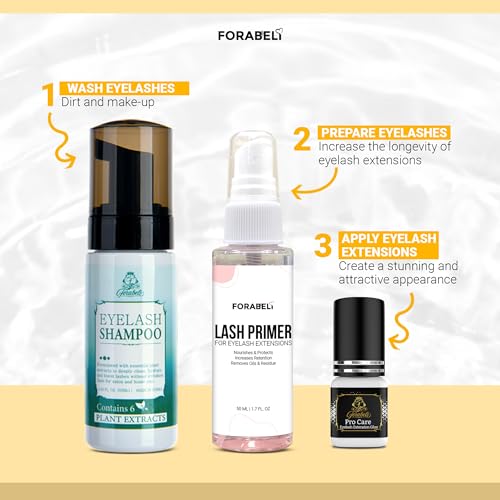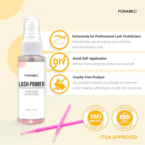 Forabeli 50ml Lash Primer is designed to prep lashes before application of extensions. It removes residual cosmetics, proteins, and oils to increase better hold of extensions to natural lashes. The primer enhances glue retention and hold strength for individual lashes, ensuring a seamless application. This premium class primer is loved by lash experts for its gentle cleaning properties and long-lasting results. Its unique formula nourishes and strengthens, promoting healthier and longer-lasting lashes. The primer is specifically designed to enhance the connection between real and extended lashes, providing a smooth and long-lasting result.