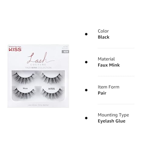 Transcend everyday beauty with the Kiss Lashes Lash Couture Double Pack Muse Black. This 2-pair value-priced set of sumptuously soft faux mink strip lashes offers a Mink Effect Design for weightless volume and curl. These lashes are as soft, ultrafine, and tapered as real mink, providing a seamless and natural look once applied.