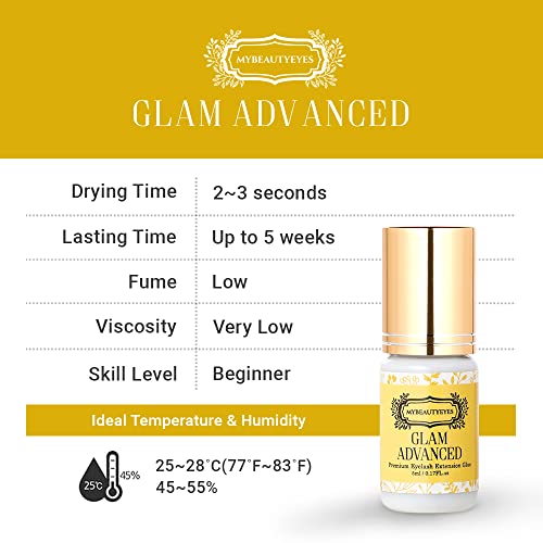 Mybeautyeyes glam advanced adhesive is a premium-quality glue designed for professional eyelash extension experts. It offers a quick drying time of 2-4 seconds, allowing for precise application and adjustment of lash positions. The longer drying time provides added comfort during use and enables the adhesive to last up to 5 weeks under proper care. This versatile adhesive is suitable for classic lash, volume lash, and Russian volume applications.