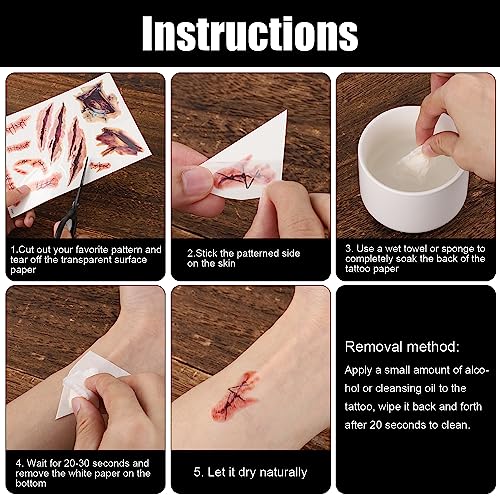 To use the tattoo stickers, cut out the desired patterns, remove the transparent papers, stick the patterns on your skin, wet thoroughly, and peel off the paper backing. To remove, use alcohol or makeup remover oil and wipe gently.