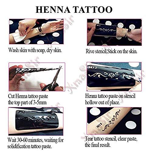 Get creative with the XMASIR 16 Sheets Henna Temporary Tattoo Stencils Kit. This kit includes 16 high-quality 3-layer PVC tattoo stencils that are safe, washable, and non-toxic. The stencils have passed strict testing and certification processes, ensuring they are safe to use. They are also reusable when used with airbrush tattoo stencils (ink not included).