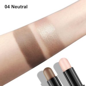 Use the highlighter end on the bridge of the nose, forehead, and chin, and apply the contouring end on the edge of the hairline, nose, and sides of the face. Blend softly with your finger or a brush for a matte and elegant finish.