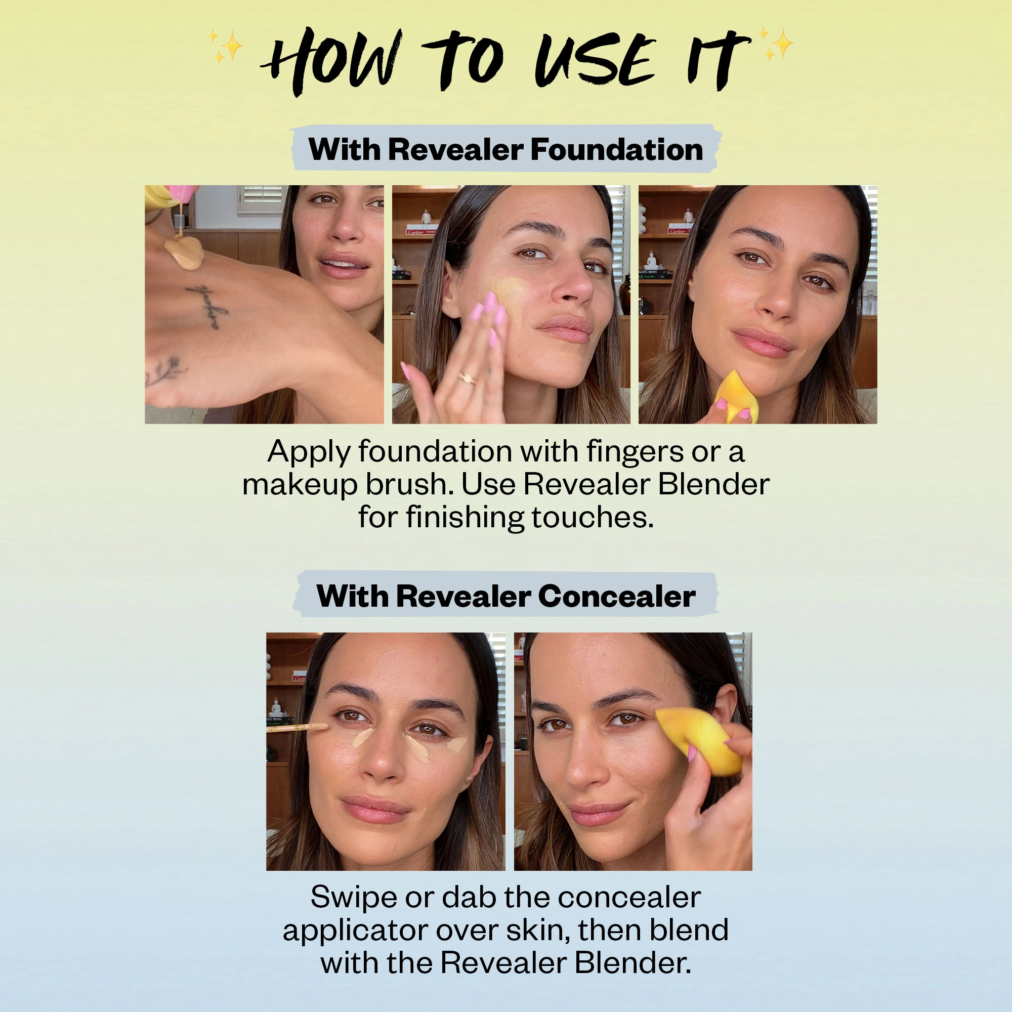 | – Swipe or dab the Revealer Concealer doe-foot applicator over skin, then blend with the Revealer Blender | |