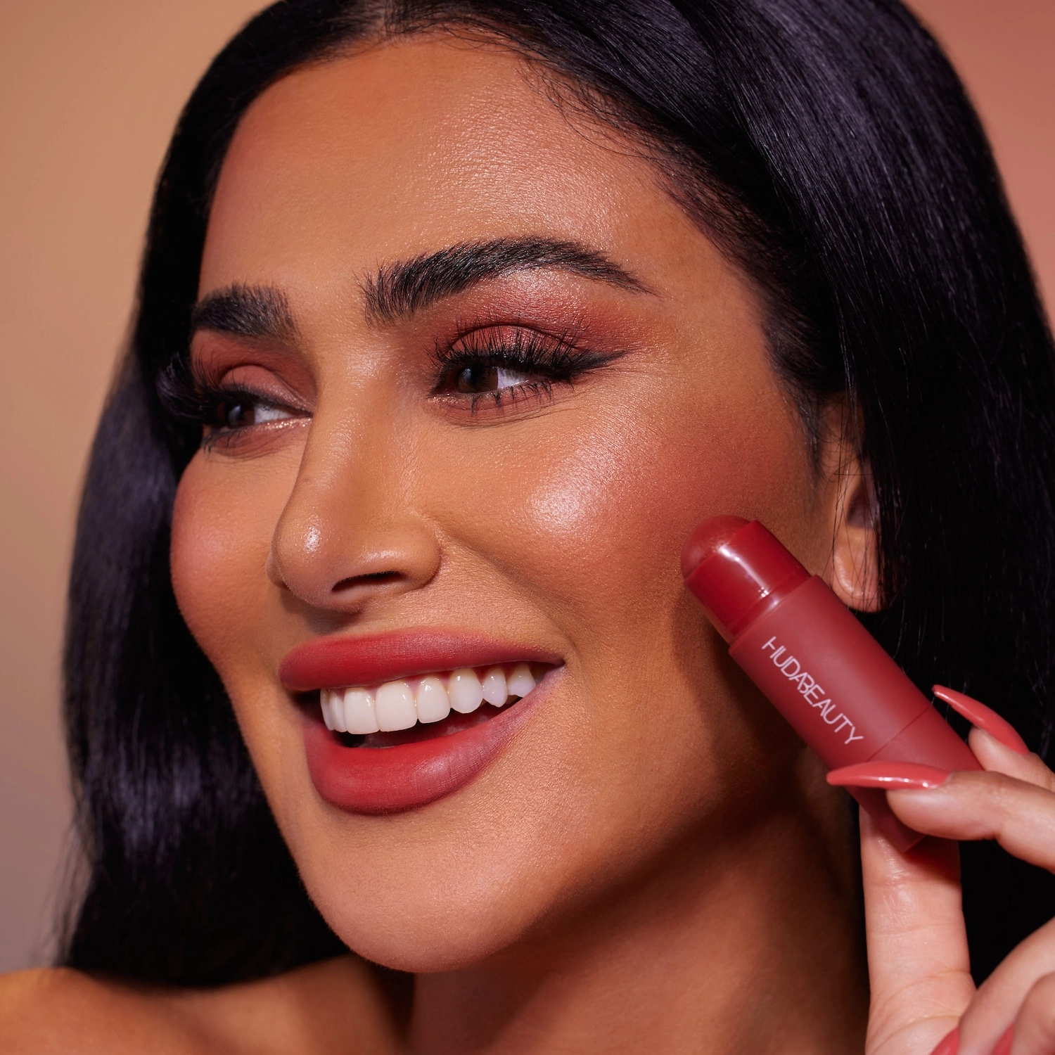 Get a juicy, dewy glow with HUDA BEAUTY Cheeky Tint Cream Blush Stick in Rebel Red. This award-winning blush stick melts into your skin, leaving behind a beautiful rusty red tint. The hydrating and long-wearing formula ensures a natural finish that lasts all day.