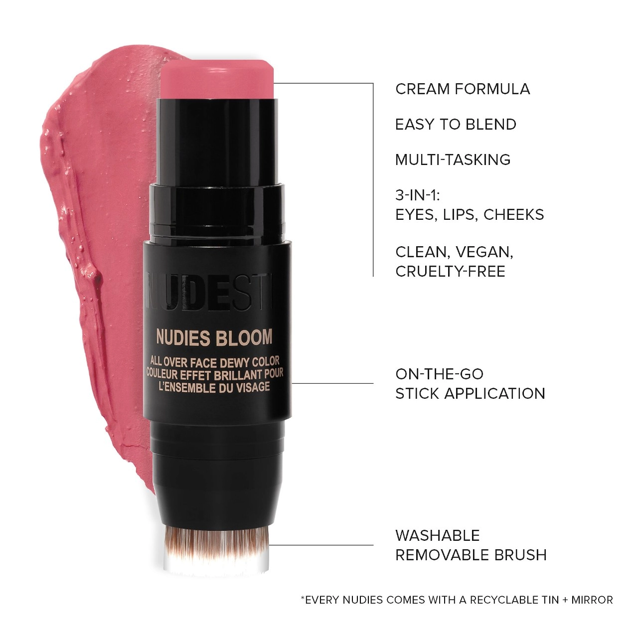 Applying the NUDESTIX Nudies Cream Blush All-Over-Face Color is a breeze. Simply swipe the stick directly onto your skin and blend with your fingers or a stippling brush. For a more intense color payoff, build and blend as desired. If you’re wearing foundation, apply a light base before applying the blush. If you’re wearing medium-to-full coverage foundation, use your fingers and a brush for application.