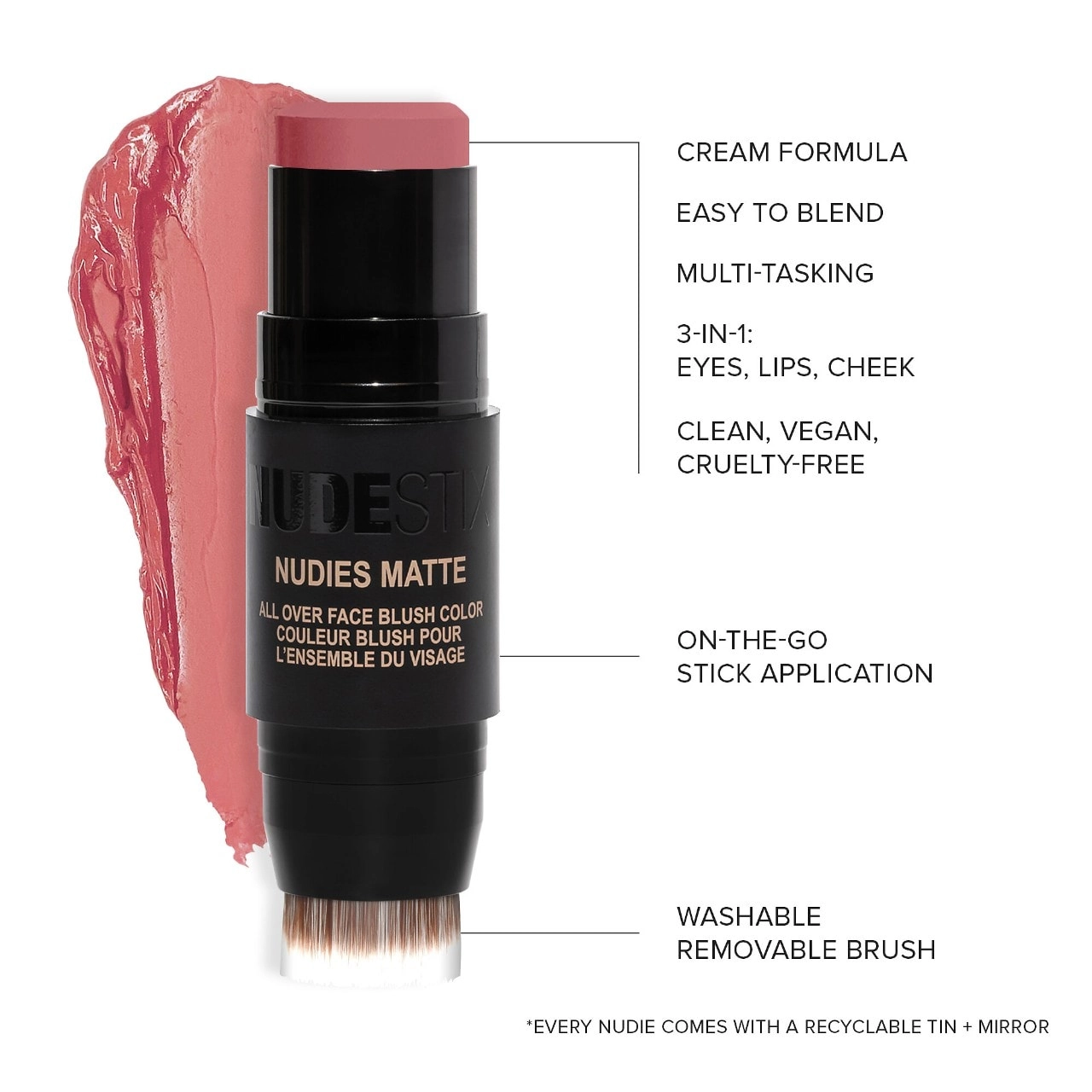 To achieve a natural, dewy finish, simply swipe the NUDESTIX Nudies Cream Blush All-Over-Face Color onto your eyes, cheeks, and lips. You can apply the color directly to your skin using the stick, your fingers, or a brush, and then blend it out with a stippling brush or your fingers. For best results when applying over foundation, start with a light base directly on your skin. If you’re wearing medium-to-full coverage foundation, use your fingers and a brush to apply the blush.