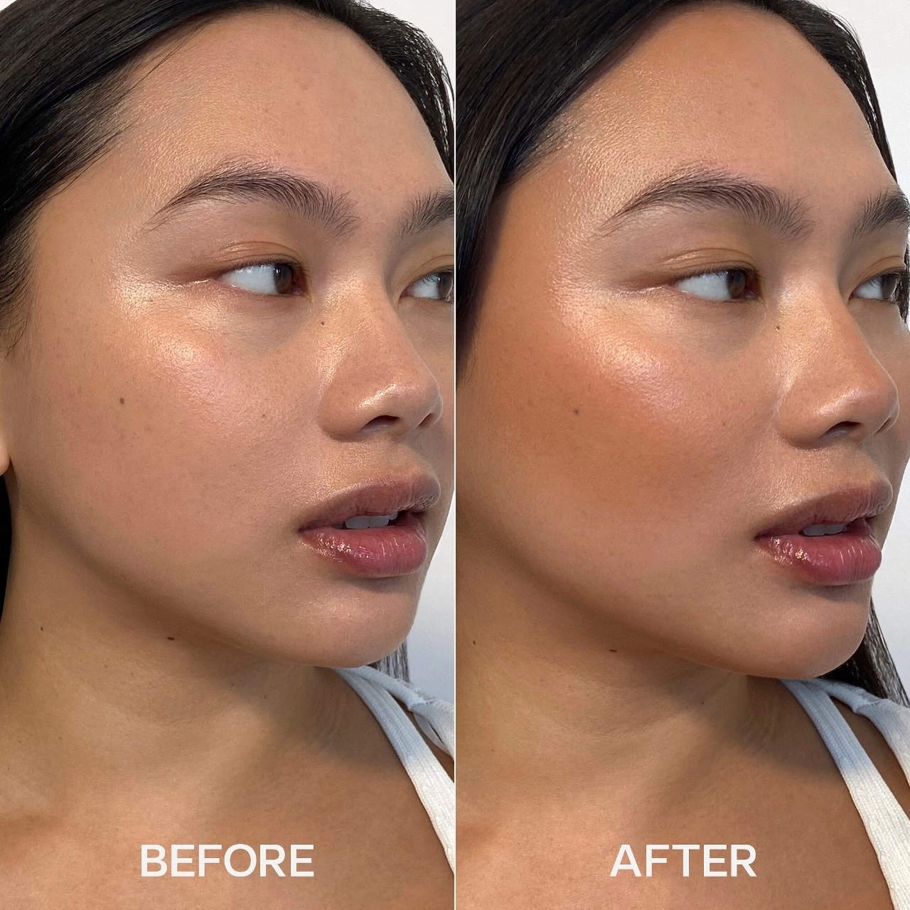 - For a sunkissed look, blend and buff a warm shade onto areas where the sun naturally hits (cheekbones, bridge of nose, temples, and forehead).