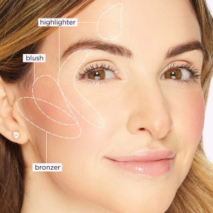 For a natural sun-kissed look, gently buff the bronzer onto your cheekbones, chin, nose, and forehead. To add a pop of color, smile to find the apples of your cheeks and sweep the blush on in an upward motion. For a radiant glow, apply the highlighter to the high points of your face, including cheekbones, nose, inner corners of eyes, and Cupid’s bow.