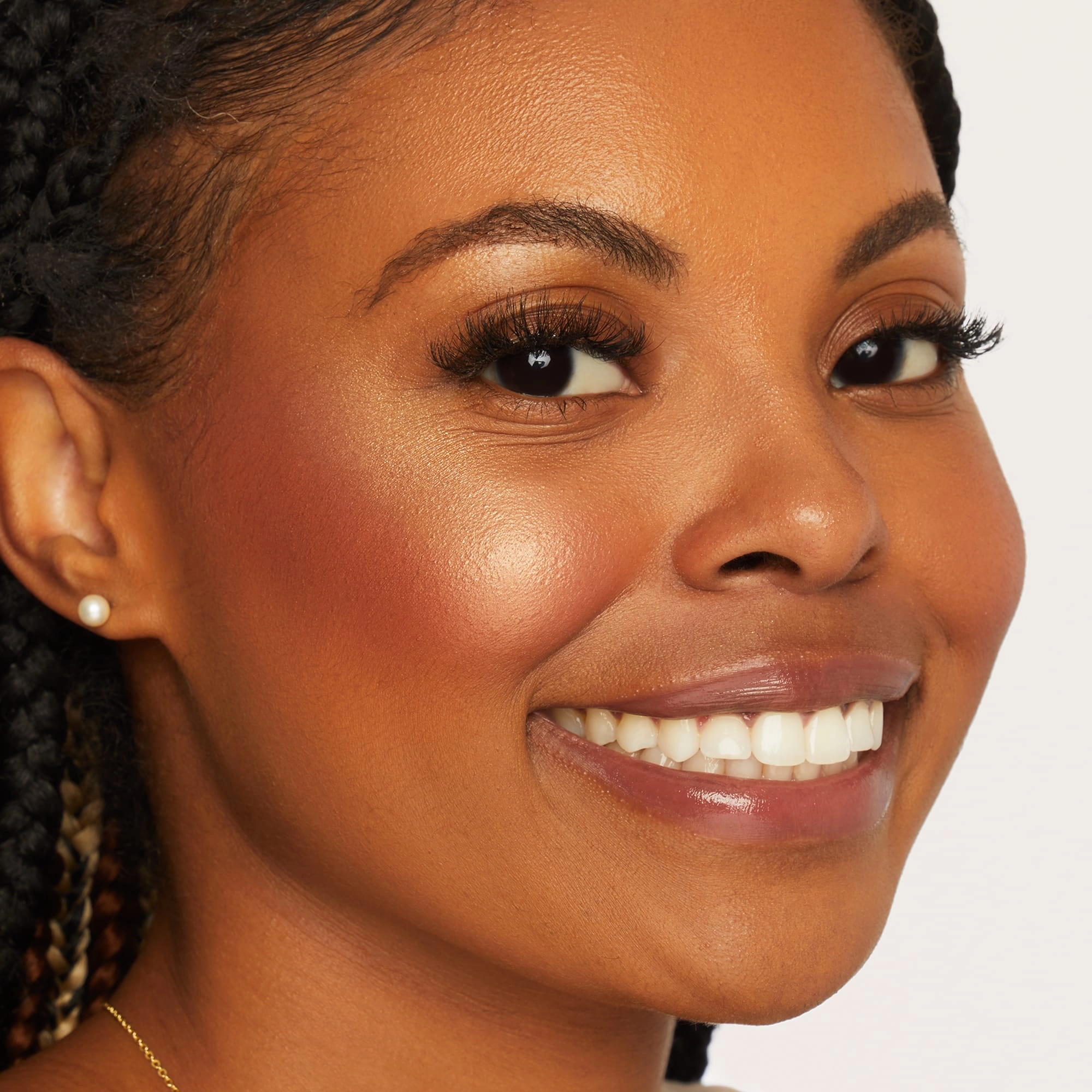 - Golden highlighter, peachy pink blush, and matte bronzer