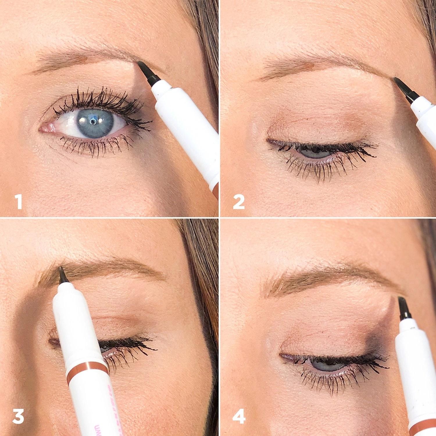 <li>Hold the pen at an angle and draw soft, hair-like strokes upwards to tint, fill, and define your brows.</li>