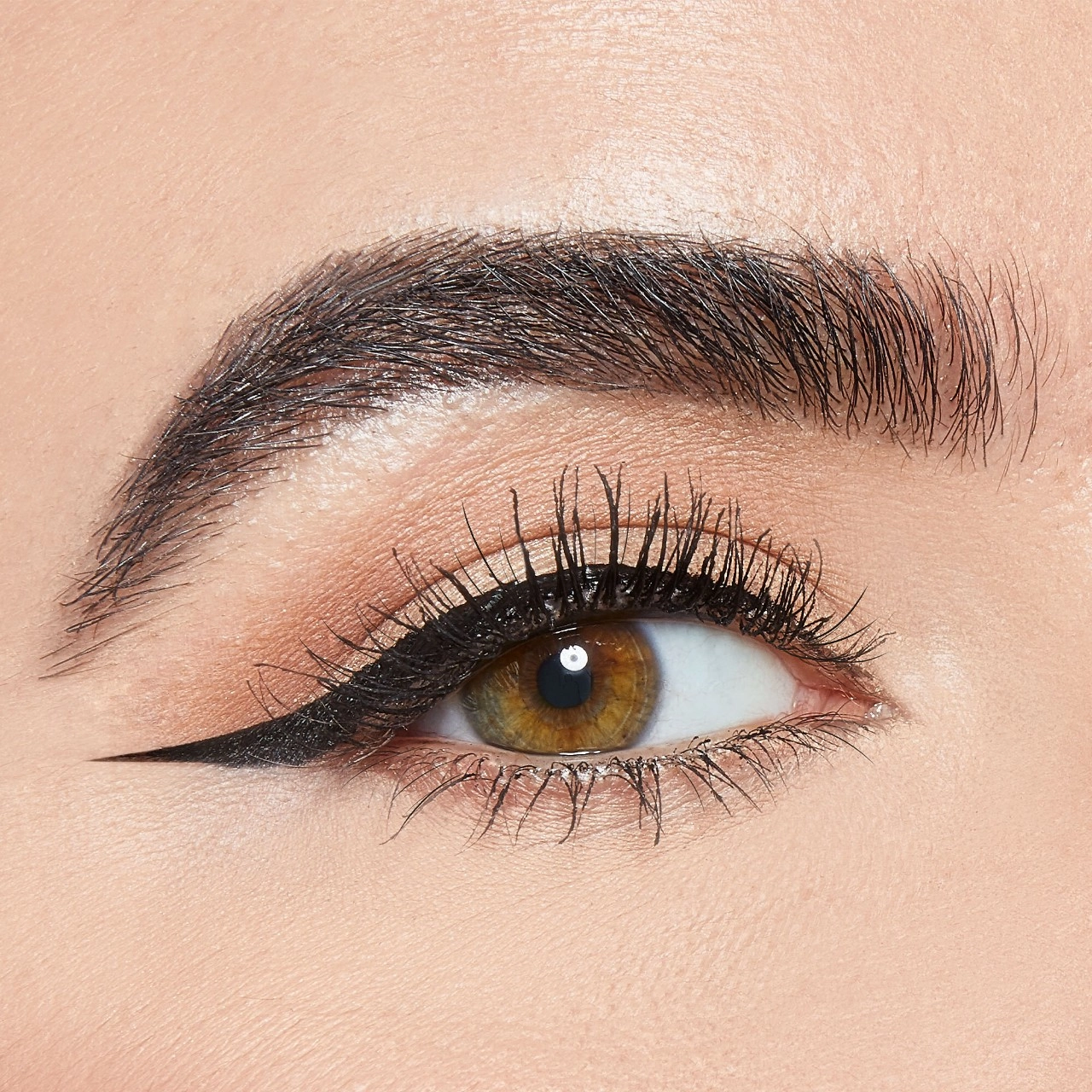 - Use the liquid liner on the opposite end to create a pigmented, defined stare or a more dramatic wing, holding the precision tip at a slight angle to trace it along the upper lash line.